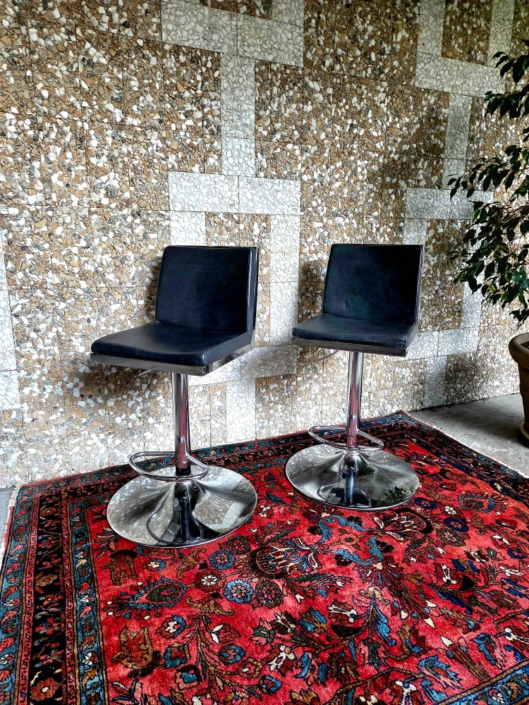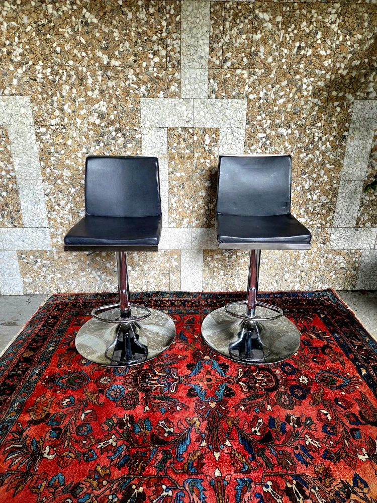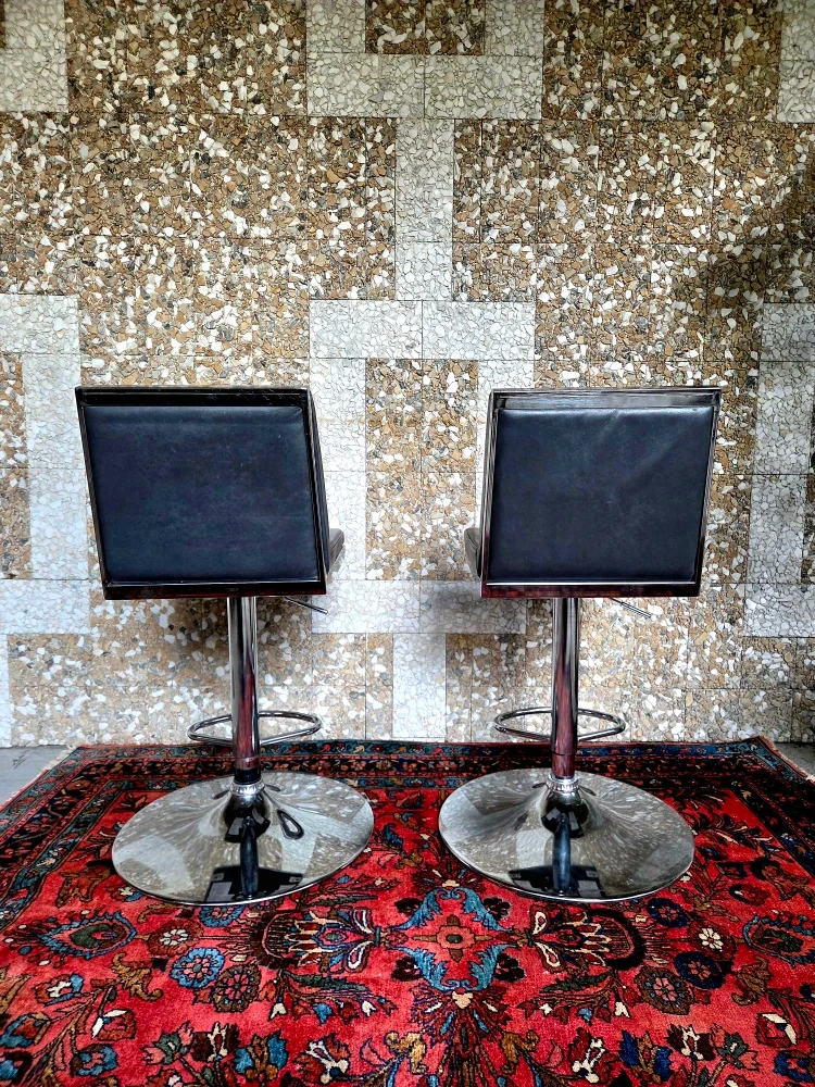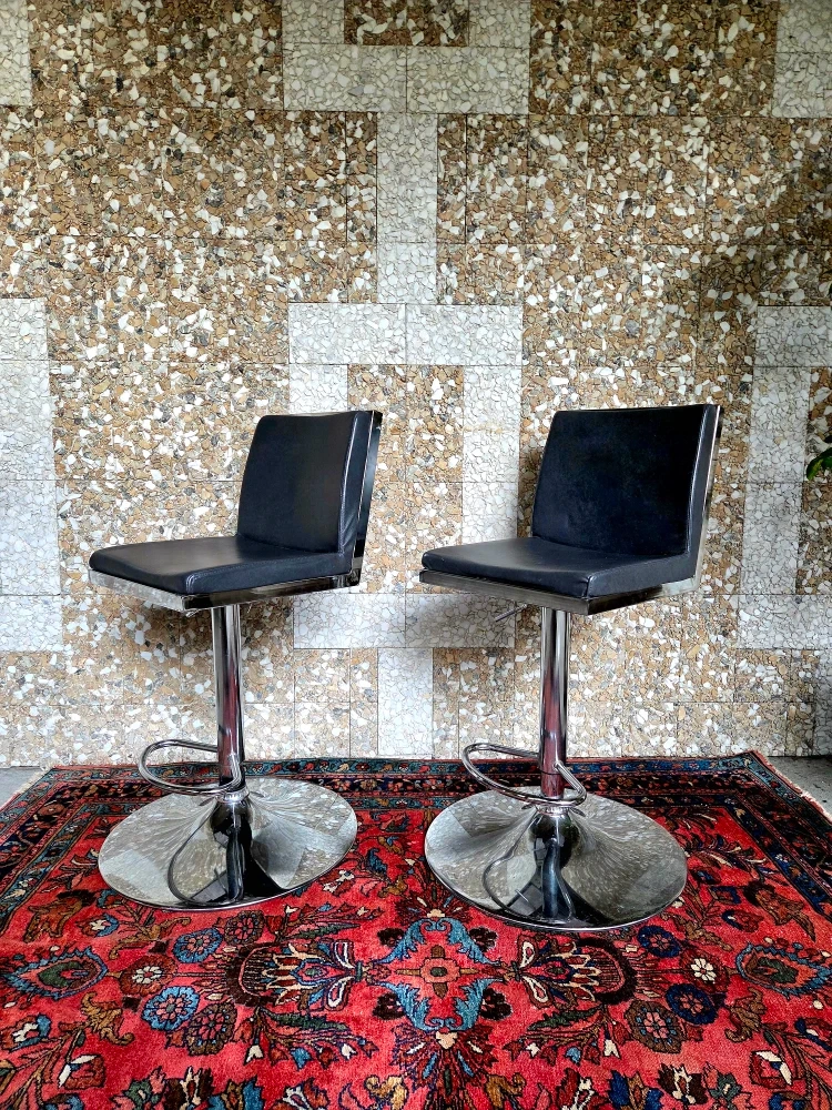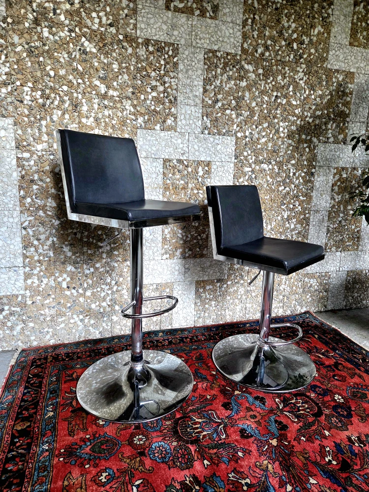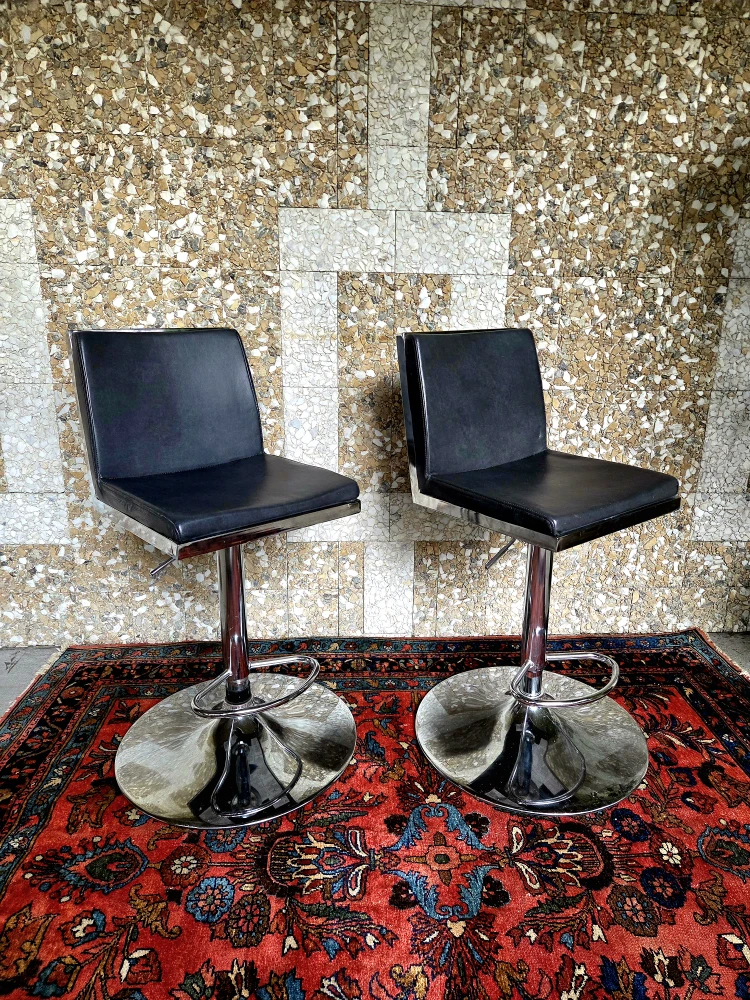 Matching pair of high-end adjustable height gaslift swivel bar/counter height stools with a chrome base and black leather upholstery.