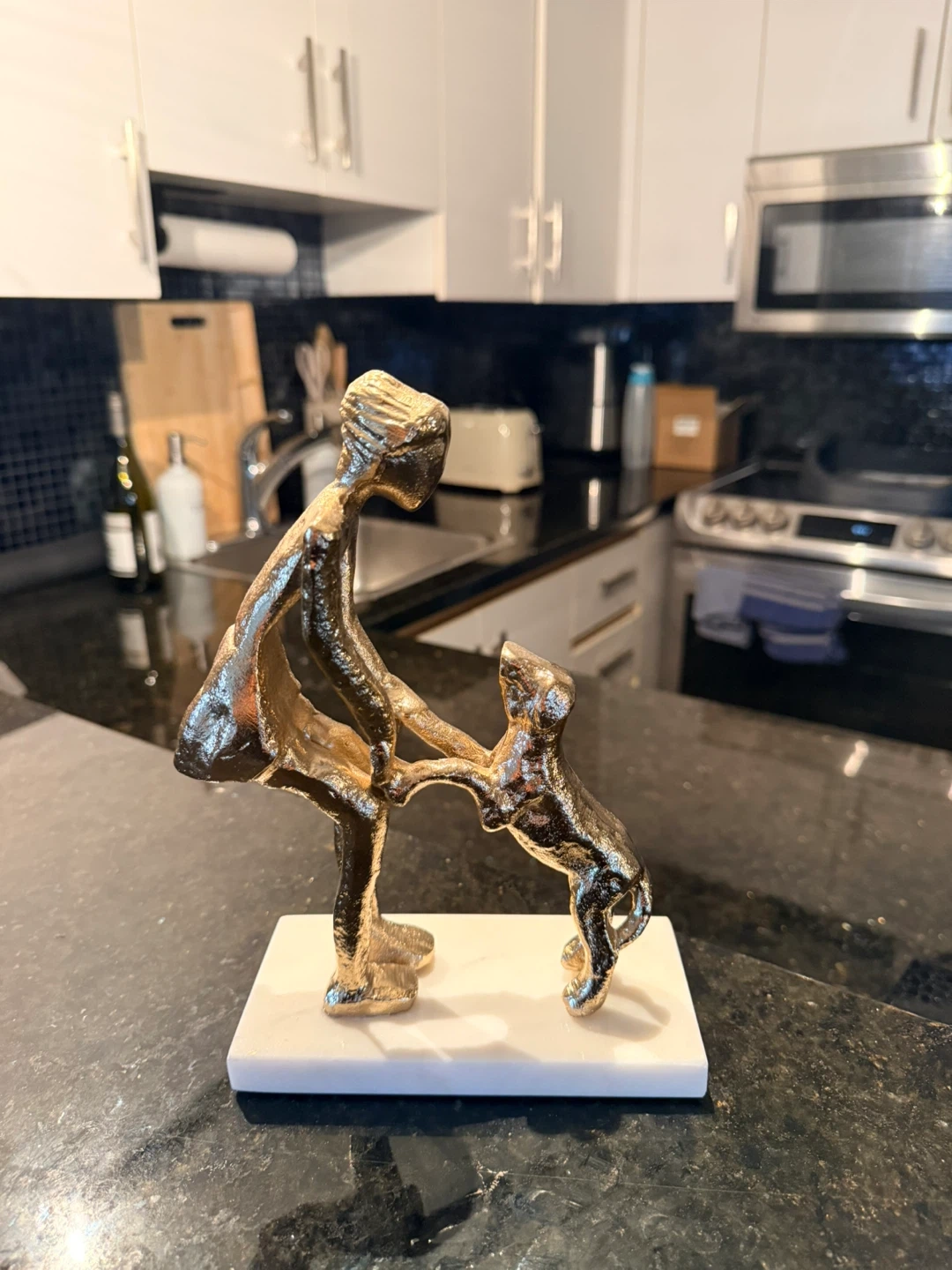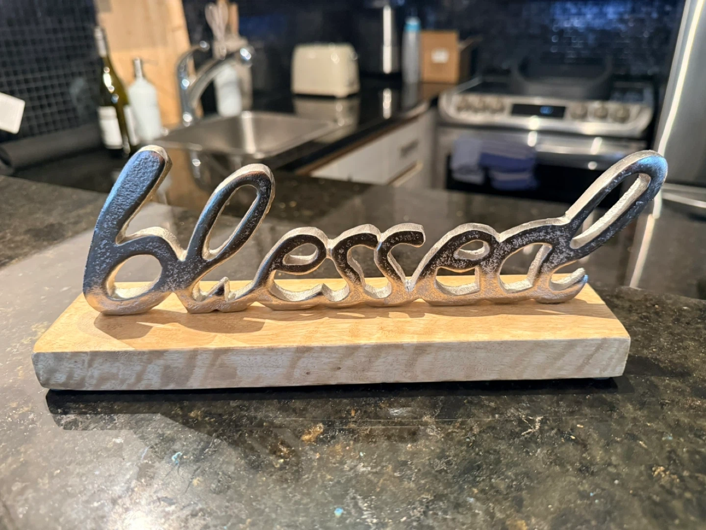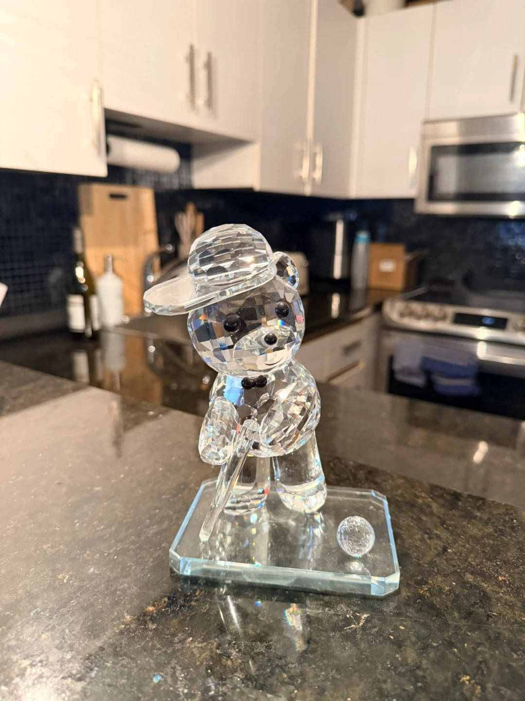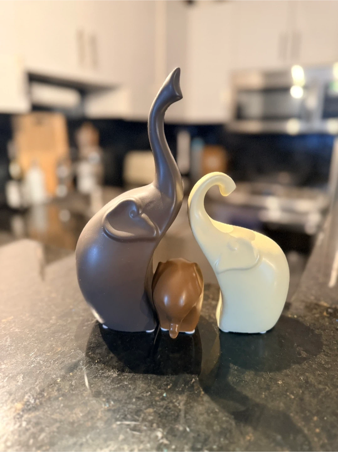 A collection of home decor figurines to add a touch of personality to your space! Includes a crystal bear figurine, a gold-tone figurine of a person with a dog, a family of elephants, and a 'Blessed' sign.