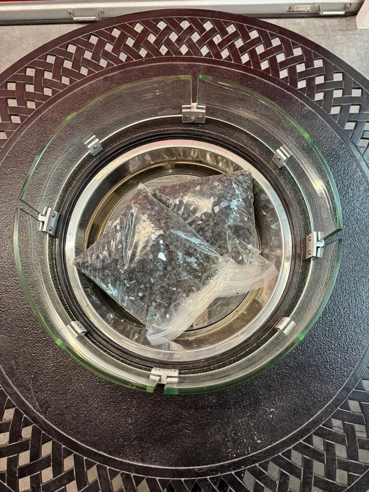Adjustable flame with 10lbs of Black Decorative Fire Glass, stainless burner bowl, and clear glass wind guard.