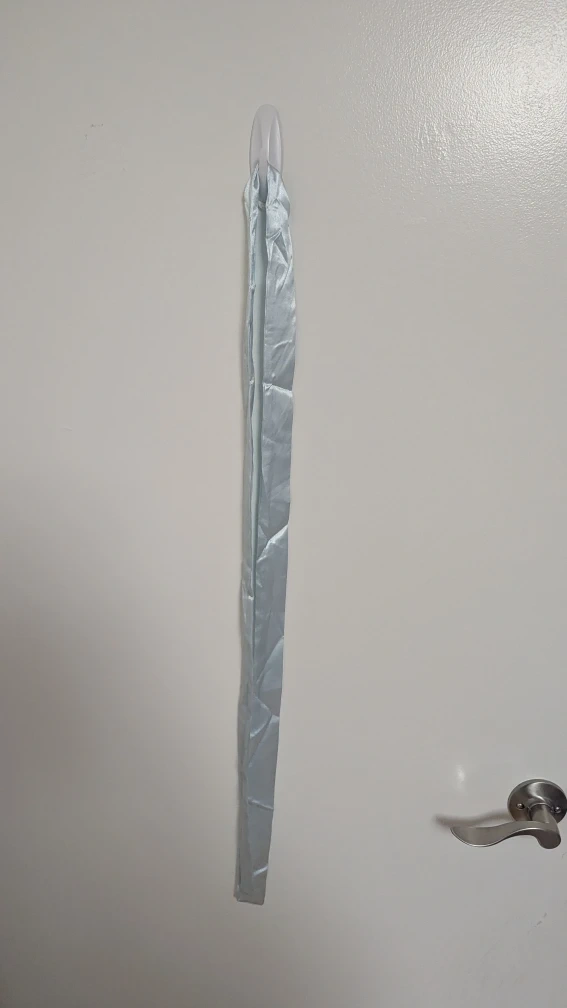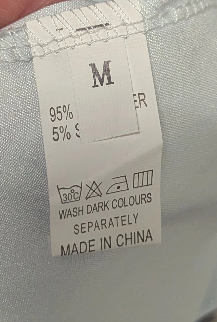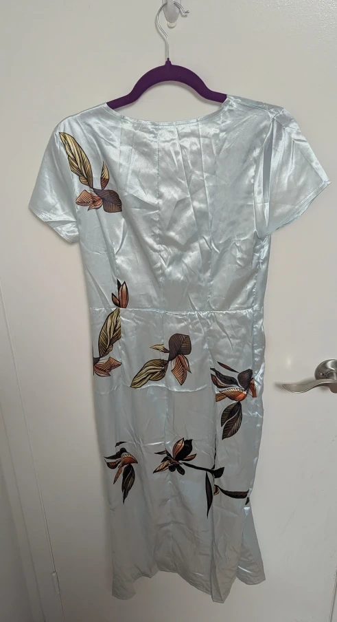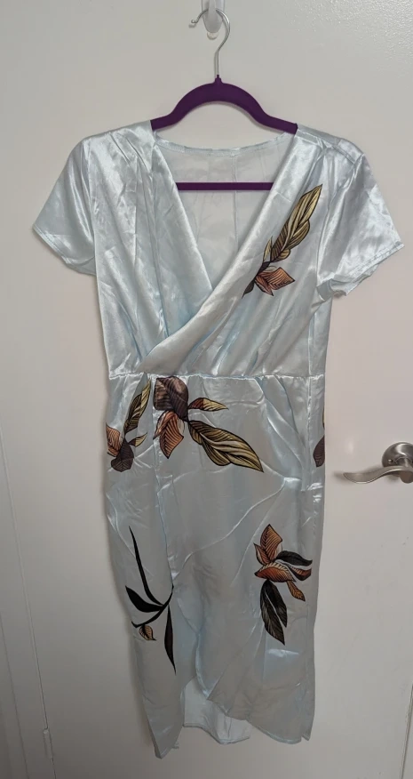 Here's a cute floral dress in size medium. It's made of 95% polyester and 5% spandex. It's a light blue colour with a leaf pattern and comes with a wrap belt as pictured.