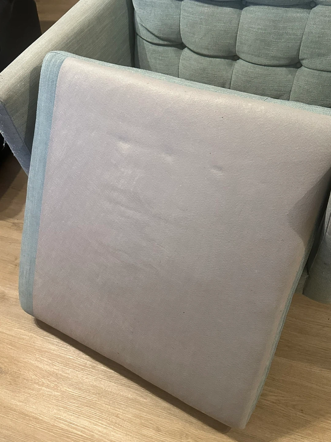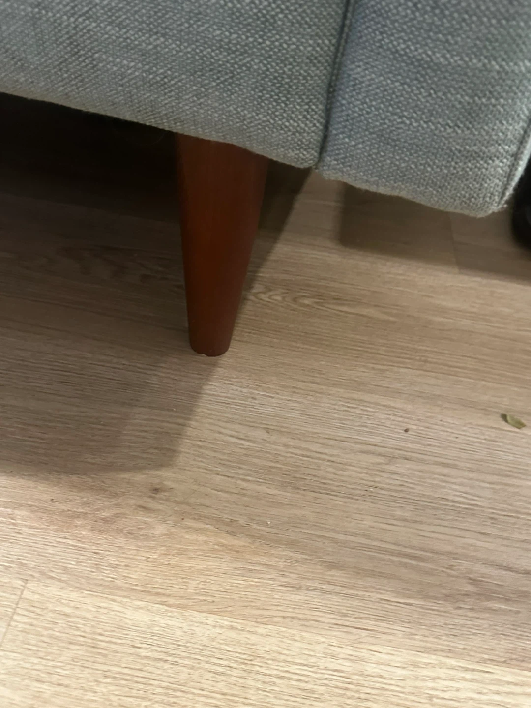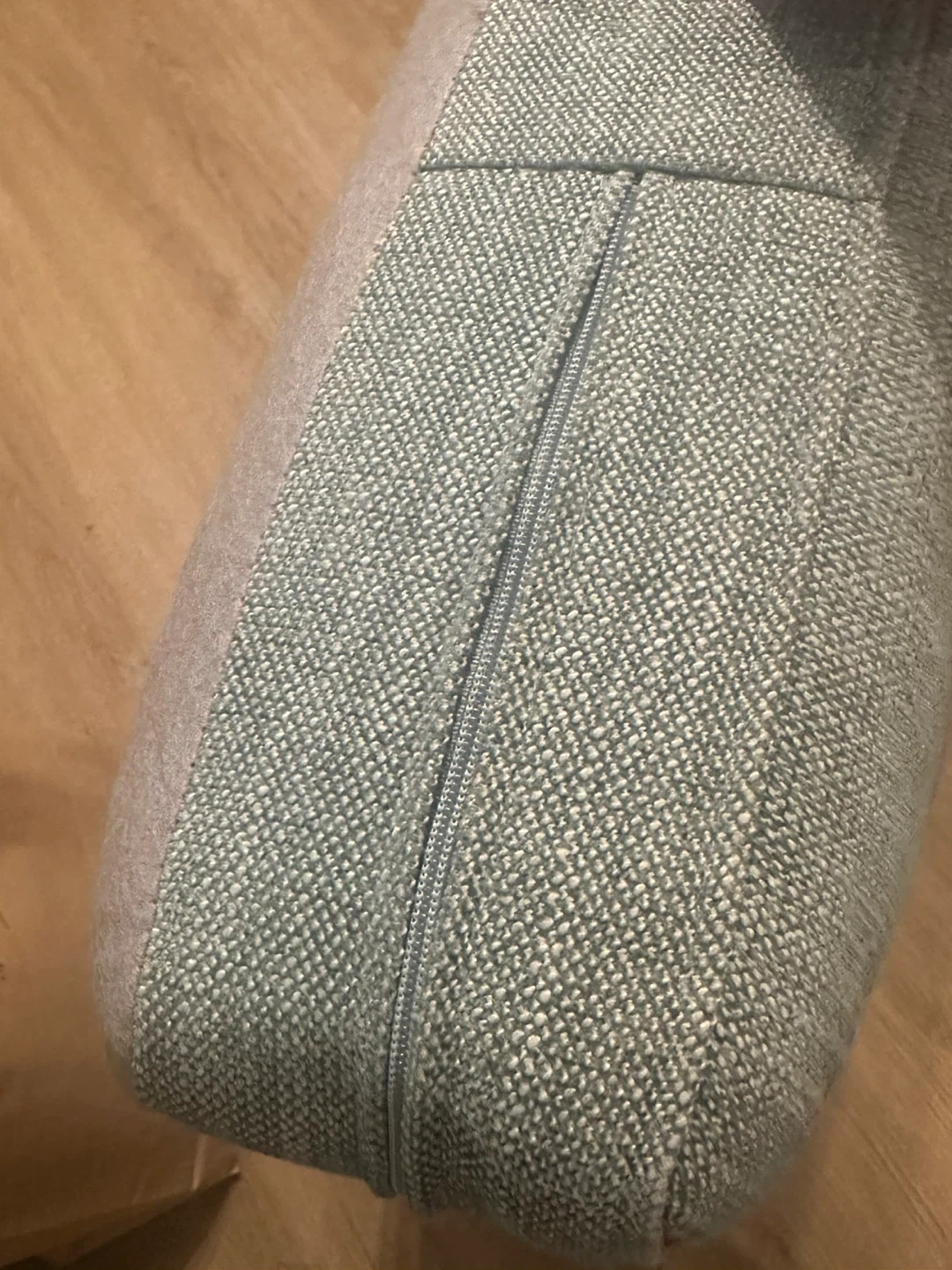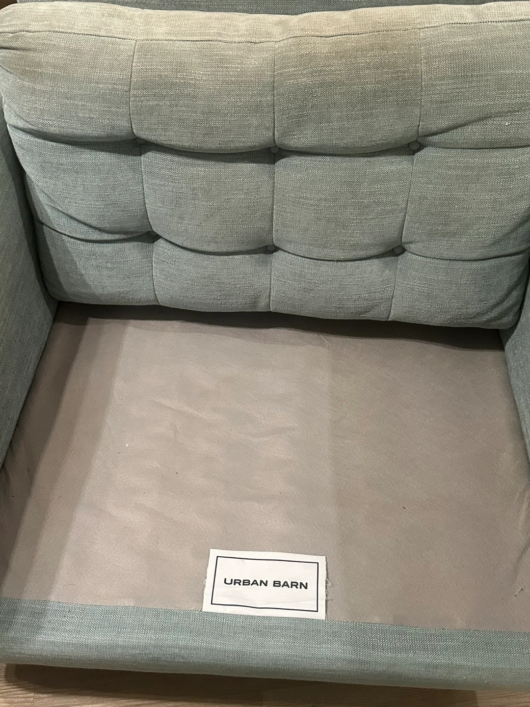 Selling a light blue armchair from Urban Barn. It has a tufted back and wooden legs. There are some signs of wear and tear. It’s wide enough for two people to sit together and it’s very sturdy the cushion cover is removable and washable