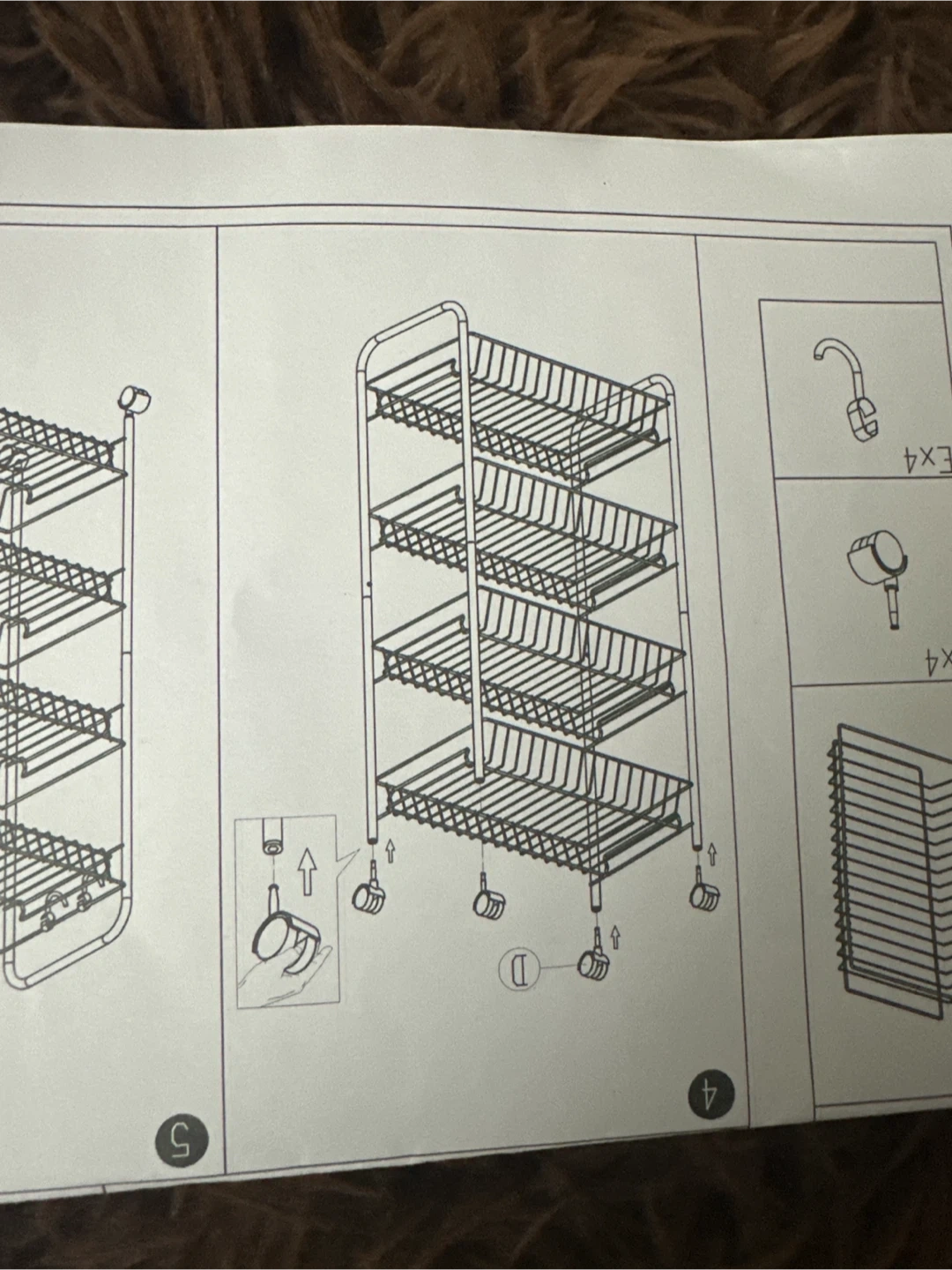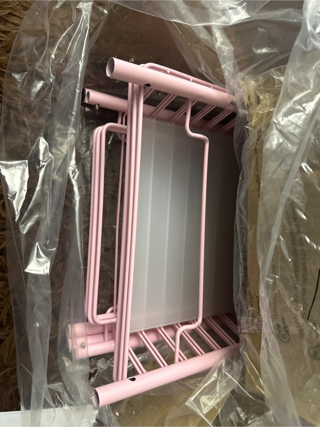 Selling a handy pink rolling storage cart with four tiers! It's perfect for organizing items in your kitchen, living room, bathroom, or even a children's room. The cart is easy to assemble and move around thanks to its rolling wheels. It's in great condition and ready to help you declutter your space