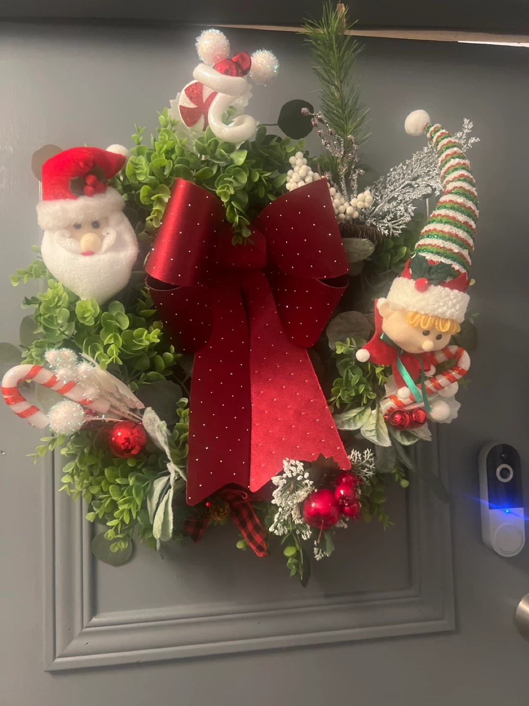 Selling a festive Christmas wreath! It features a Santa, an elf, candy canes, a red bow, and berries. Perfect for decorating your door or wall for the holidays