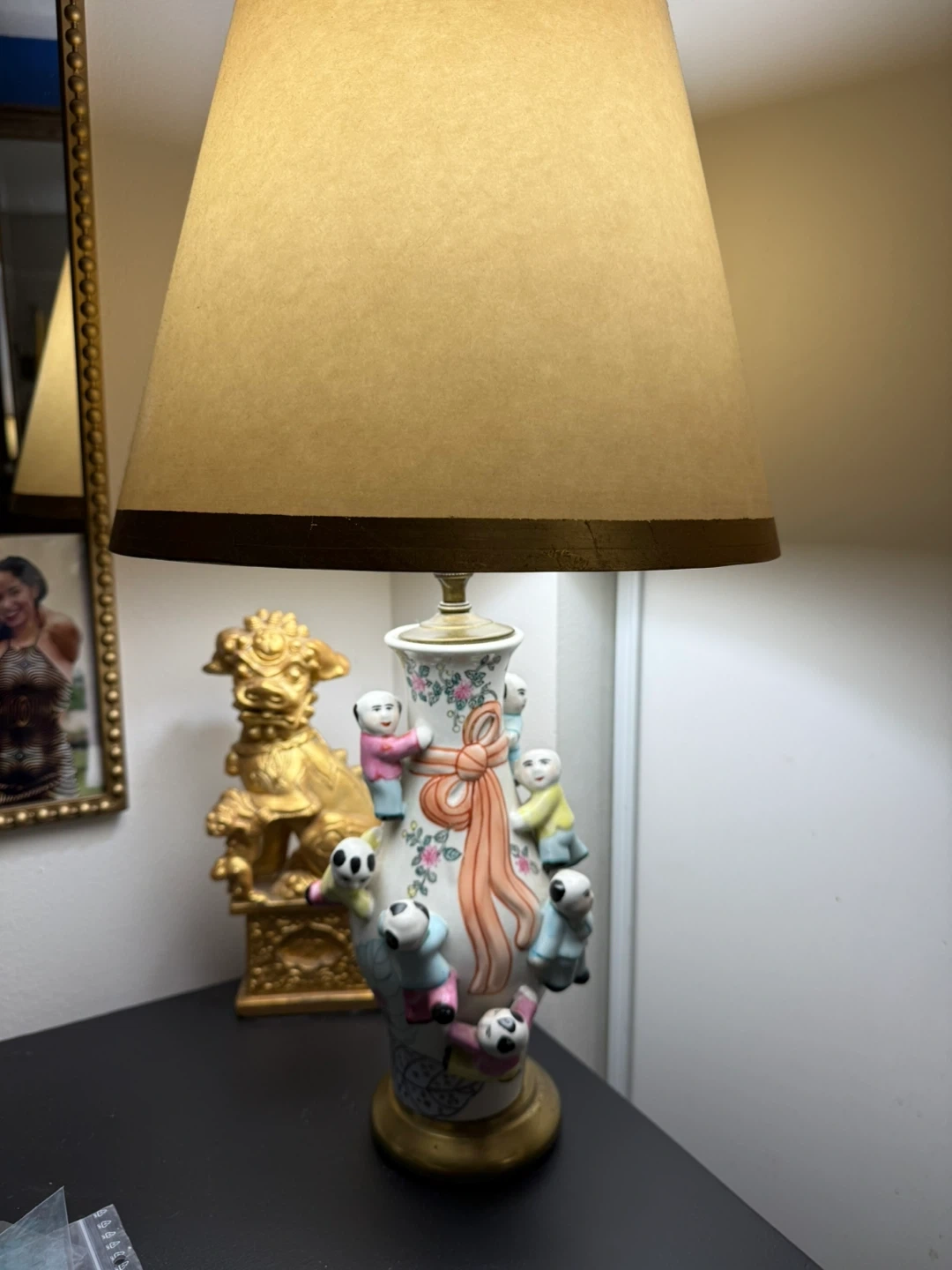 This vintage porcelain lamps features a charming design of children climbing around the vase. It adds a touch of whimsy and character to any room. Perfect for a bedside table or living room accent! I have a matching pair