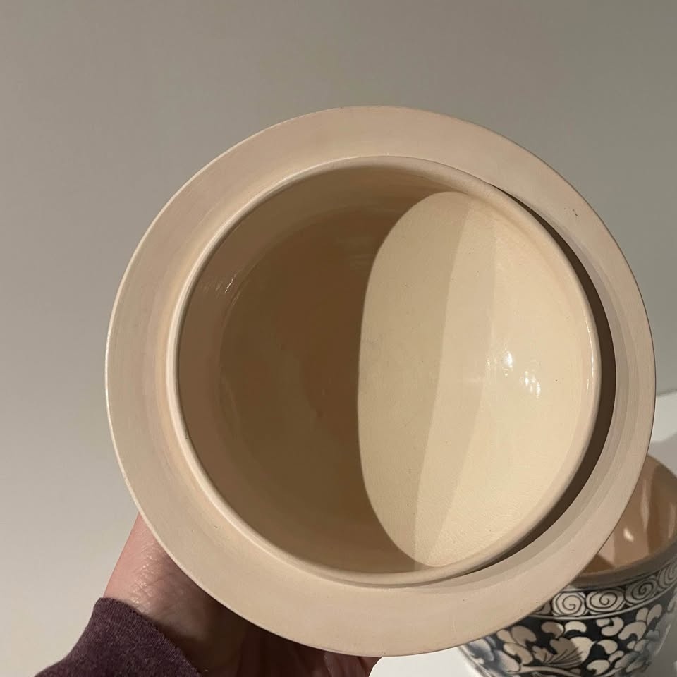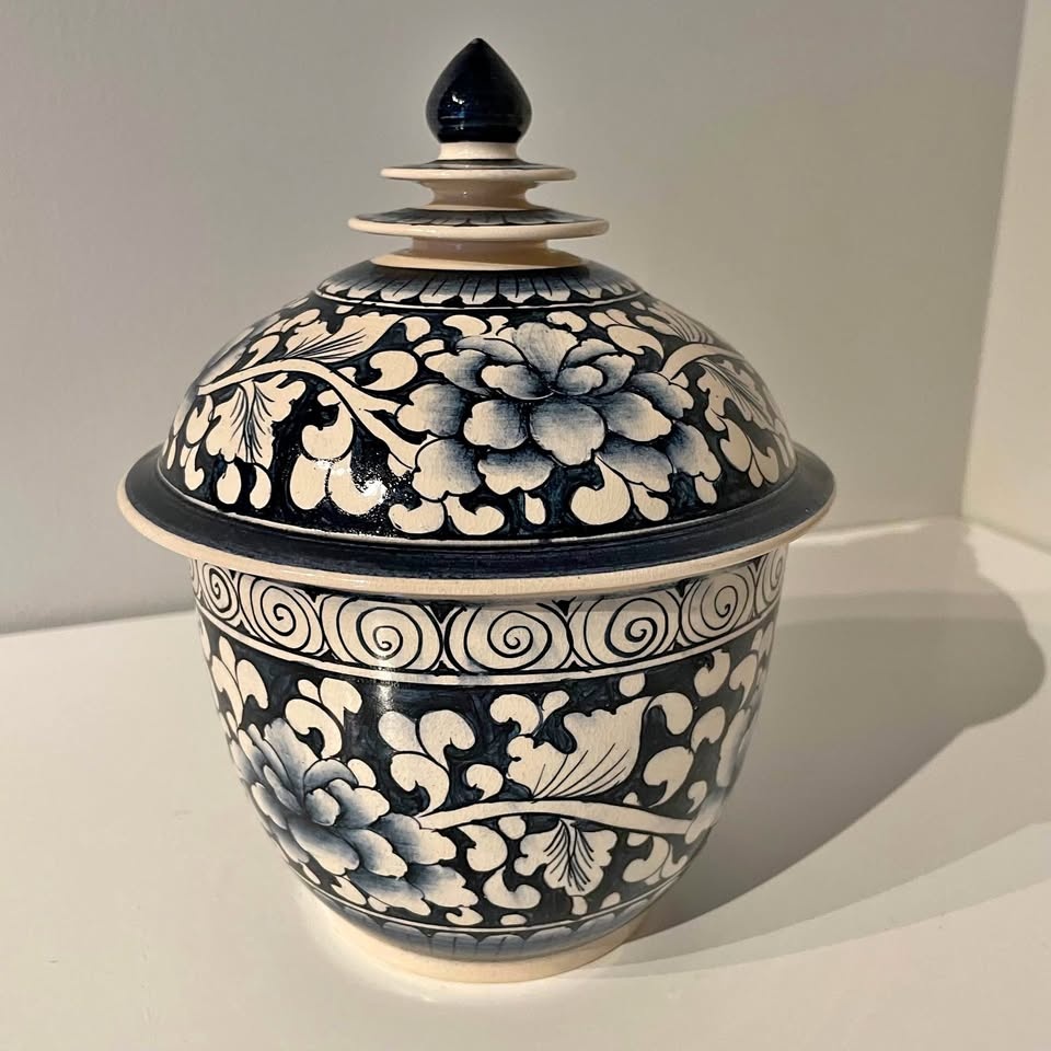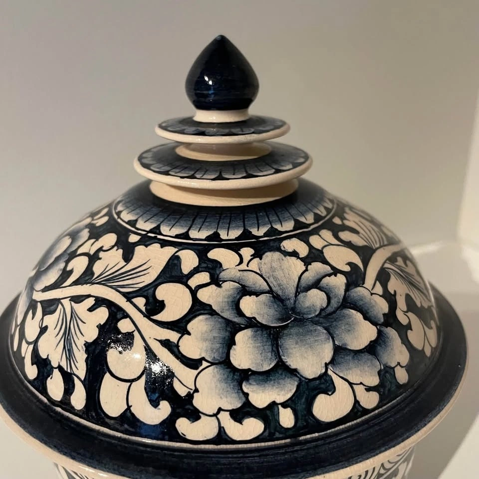 Beautiful Thai blue and white ceramic jar with floral pattern. Has a lid with a decorative finial.