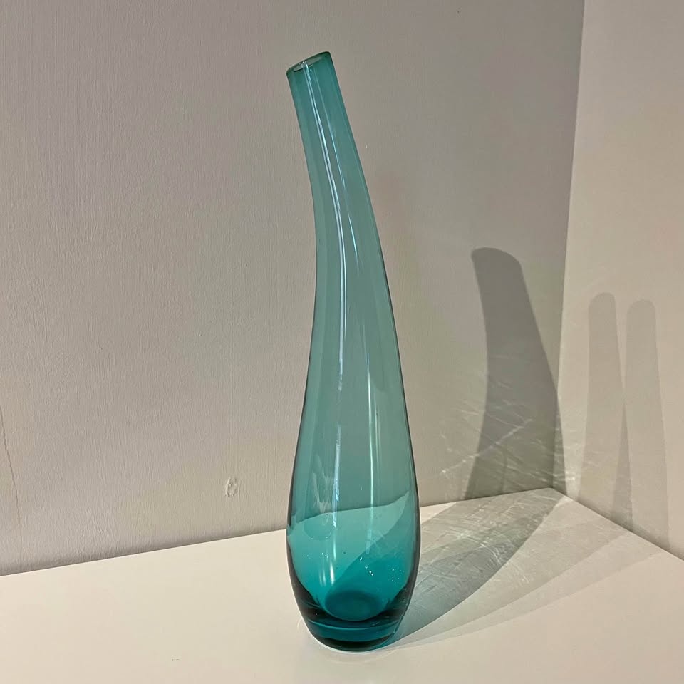 Beautiful blue glass vase with a long neck and rounded body. The vase is made of thick glass and has a nice weight to it. The blue color is vibrant and catches the light. Pick up near Dundas & Sorauren
