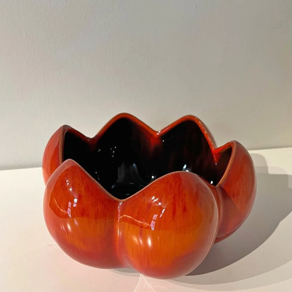 Vintage Red Orange Ceramic Scalloped Lotus Style Planter - BMP