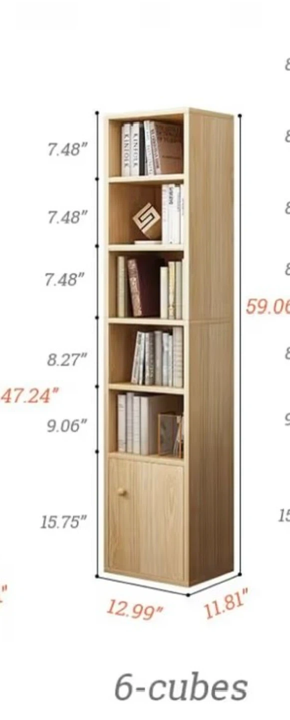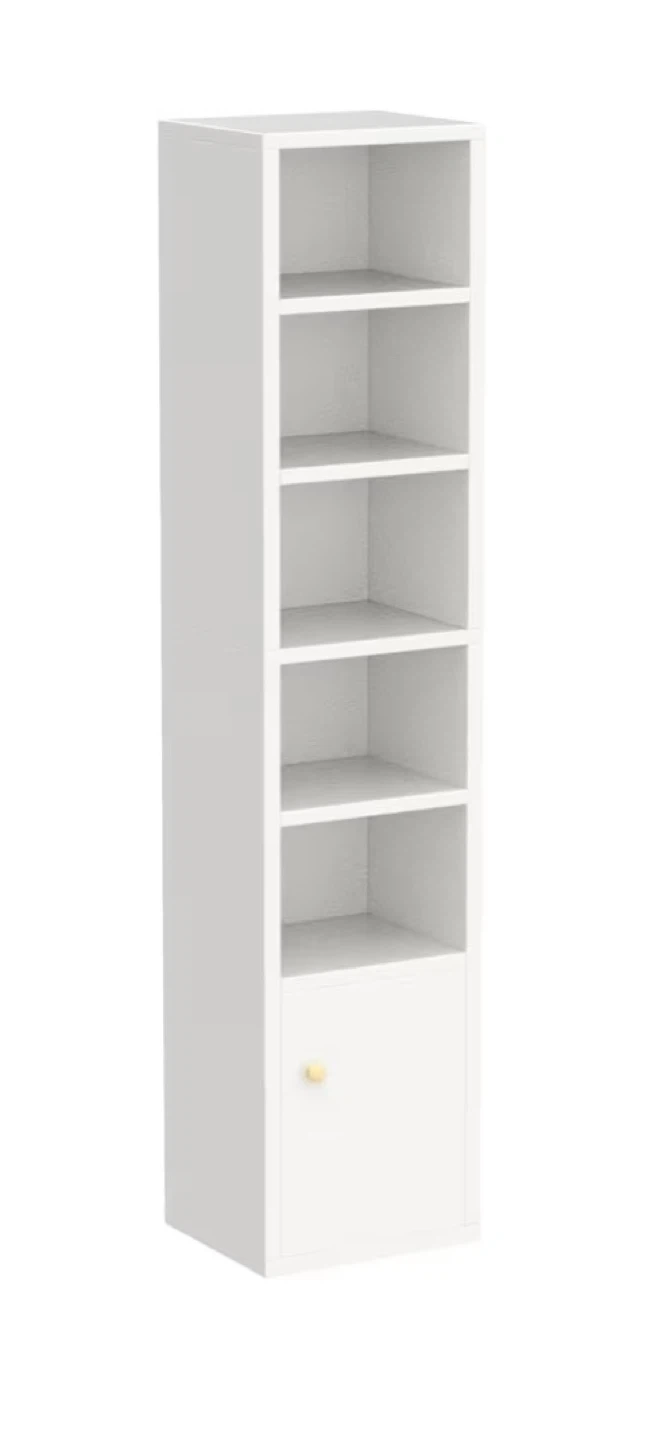 Selling a tall, narrow white bookcase! It has five shelves and a cabinet at the bottom. It's perfect for small spaces and can hold a lot of books or other items. It's in great condition!