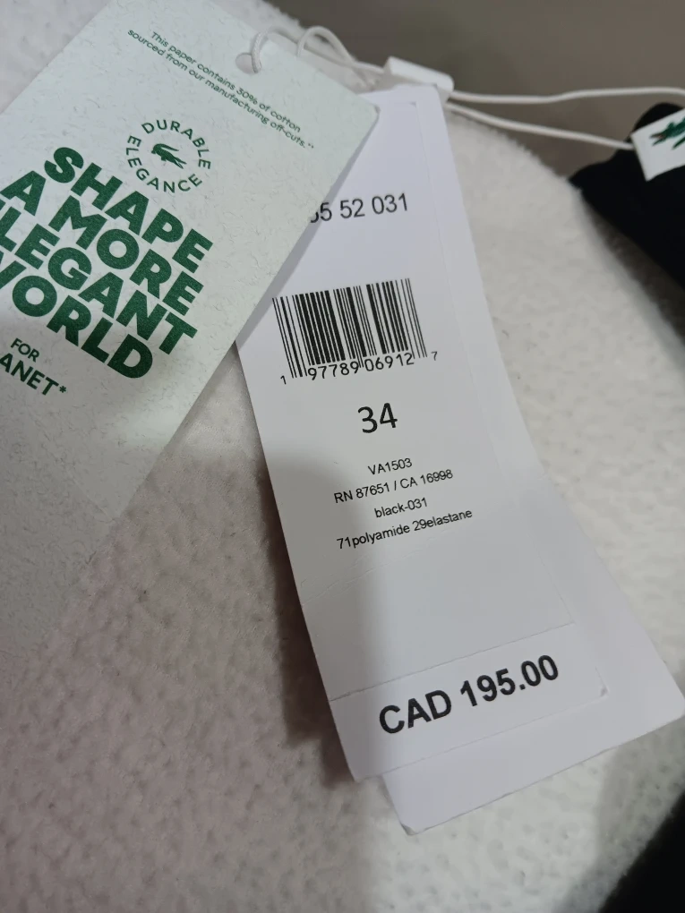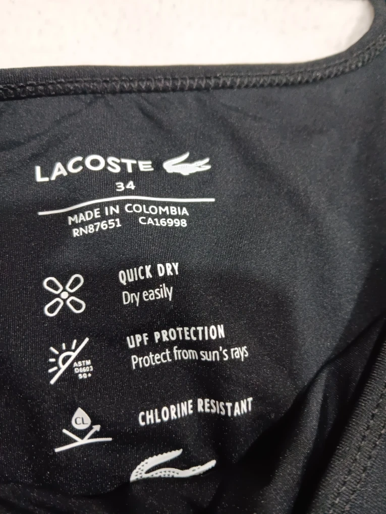 Selling a Lacoste tennis dress in black, size 34. It's made from 71% polyamide and 29% elastane. The dress is quick-drying, offers UPF protection, and is chlorine resistant. Originally bought for CAD 195.00