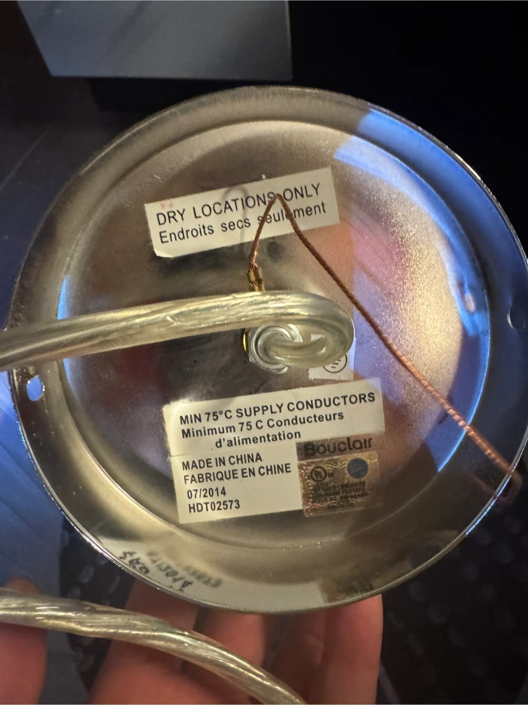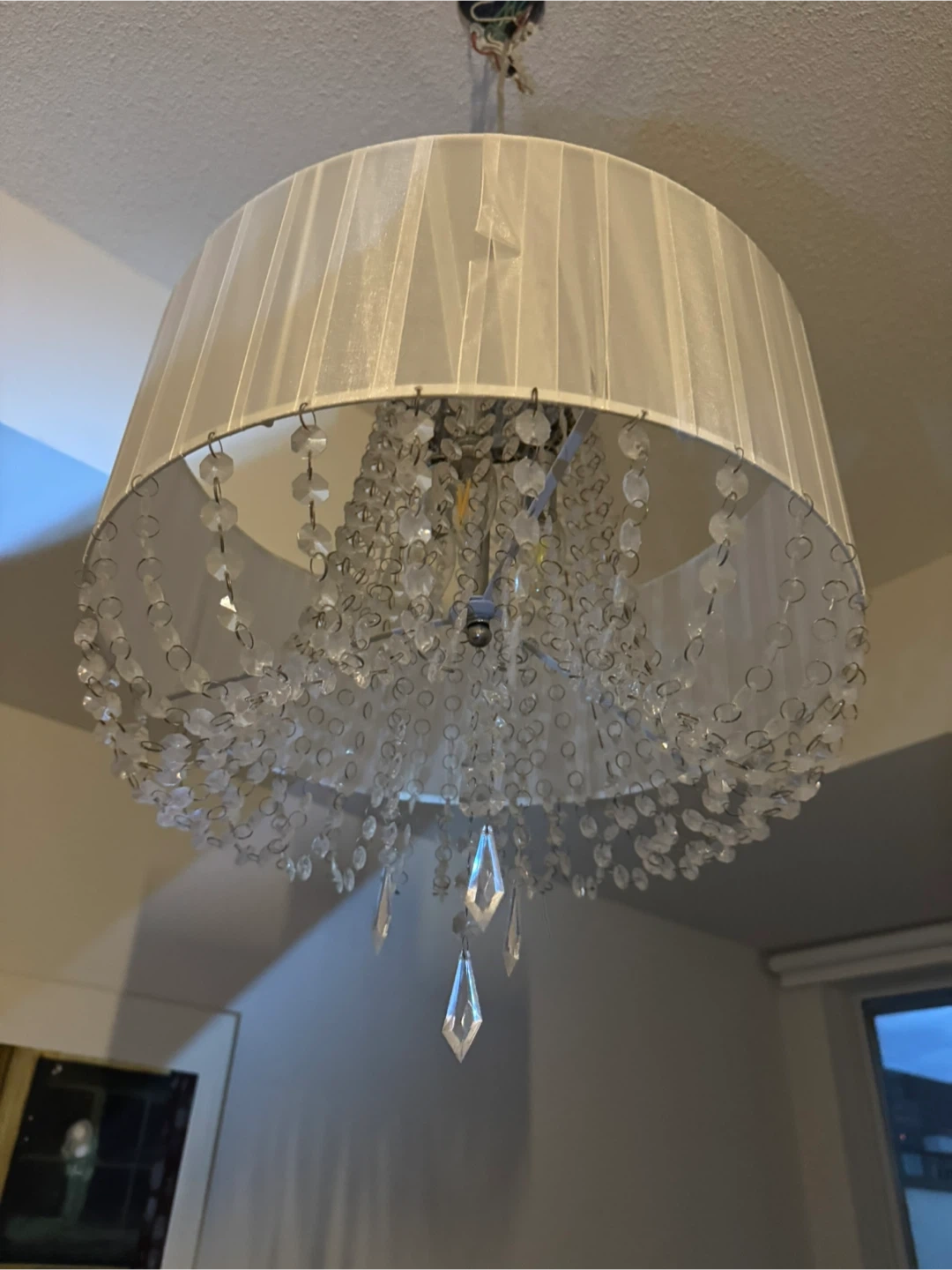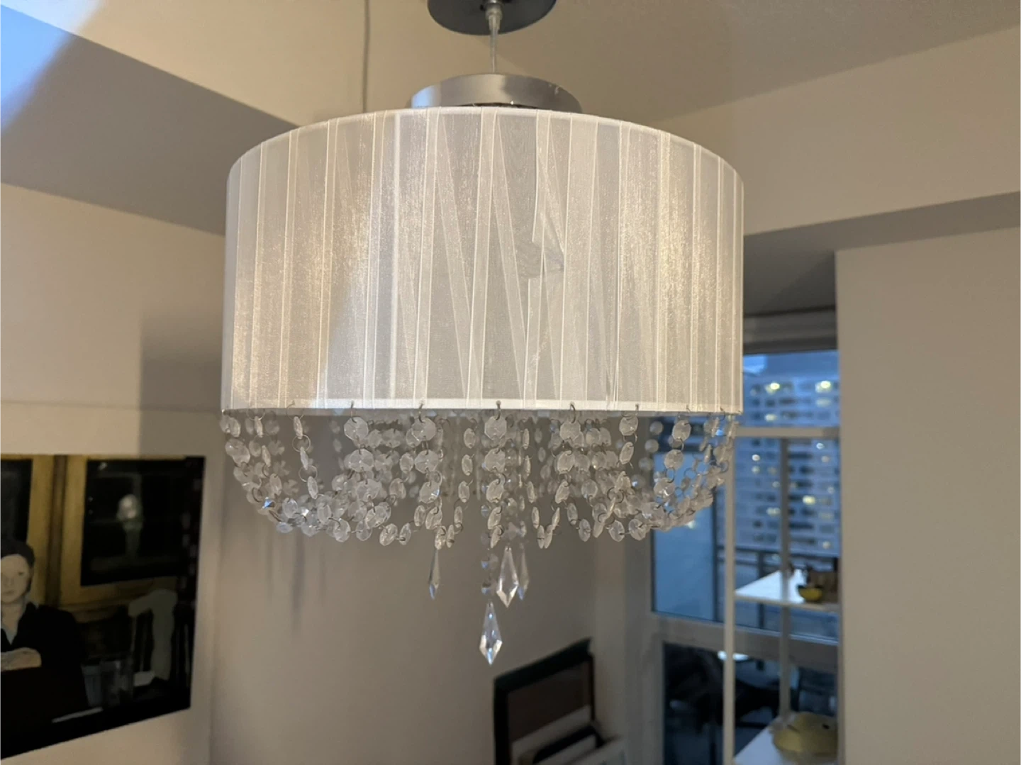 Add a touch of elegance to your home with this beautiful Bouclair chandelier! It features a white shade and crystal-like beads that create a stunning visual effect. Perfect for any room in your home