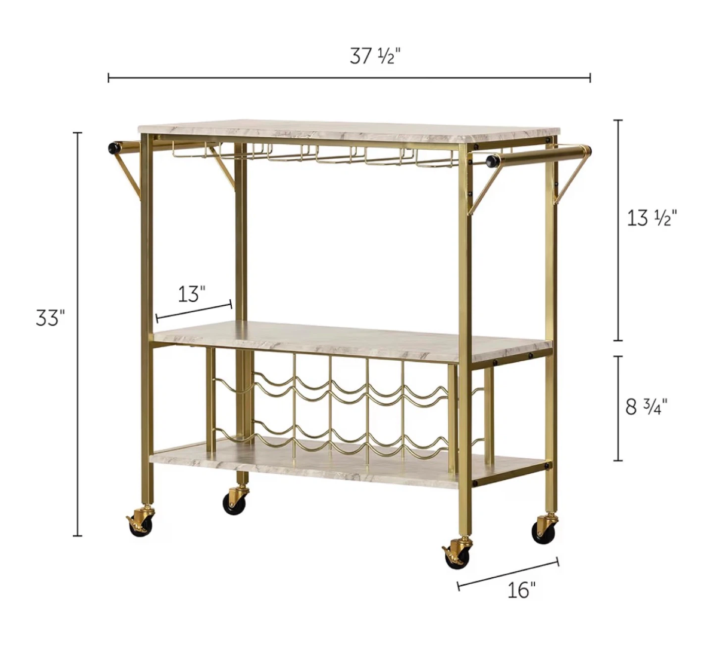Features - Locking wheels, side handles for easy moving and hanging items, bottle racks and wine glass hangers. Sturdy but chic.