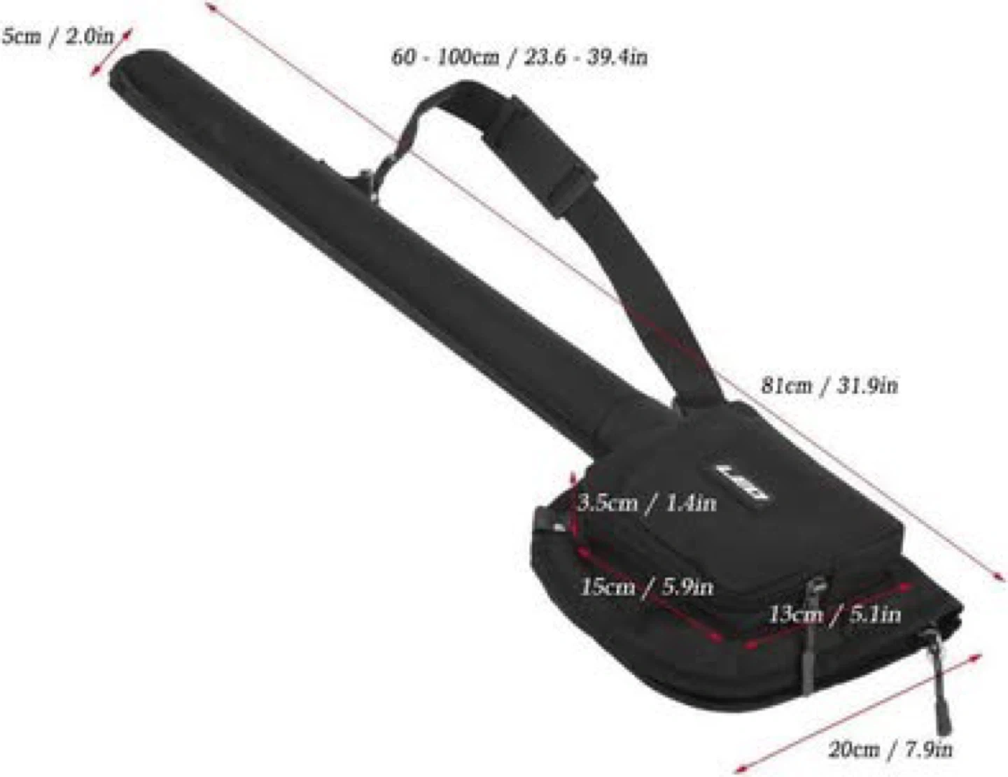 This black fishing rod bag by LED is perfect for protecting your poles, reels, and fishing gear. It features an adjustable shoulder strap with padding for comfortable carrying. There's also a storage tube for your fishing rod, an exterior pocket for fishing accessories, and a fishing reel pocket. Fishing bag only; other accessories are not included