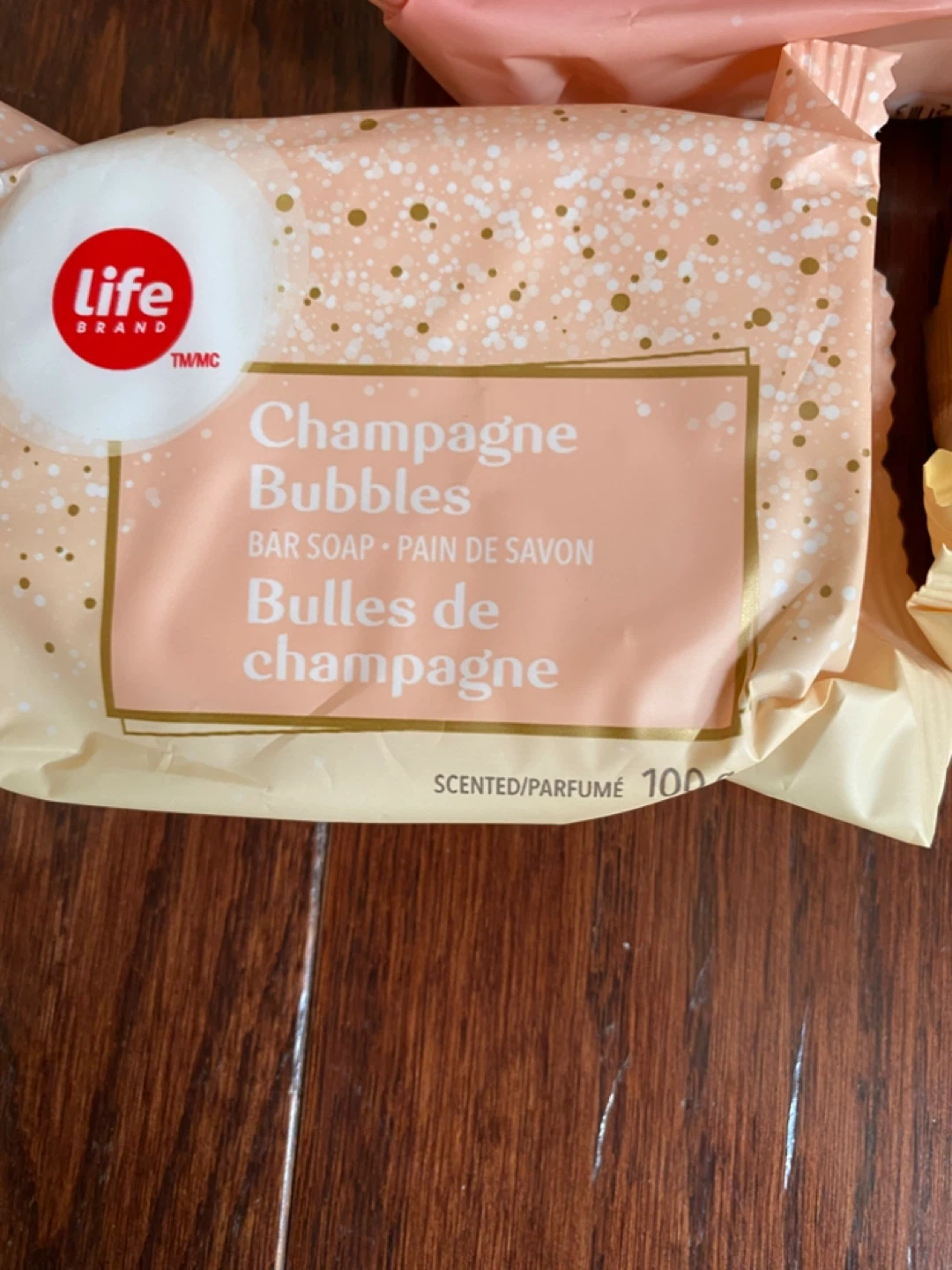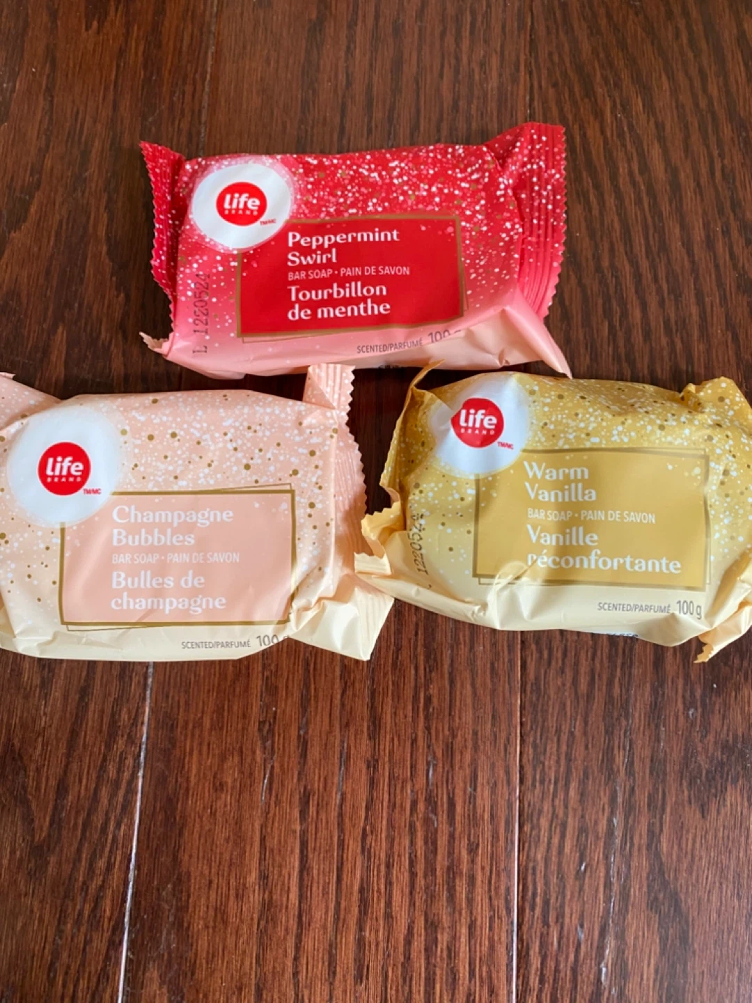 Selling a new set of Life Brand bar soaps. The set includes three different scents: Peppermint Swirl, Champagne Bubbles, and Warm Vanilla. Each bar is scented and weighs 100g. Perfect for adding a touch of luxury to your daily routine!