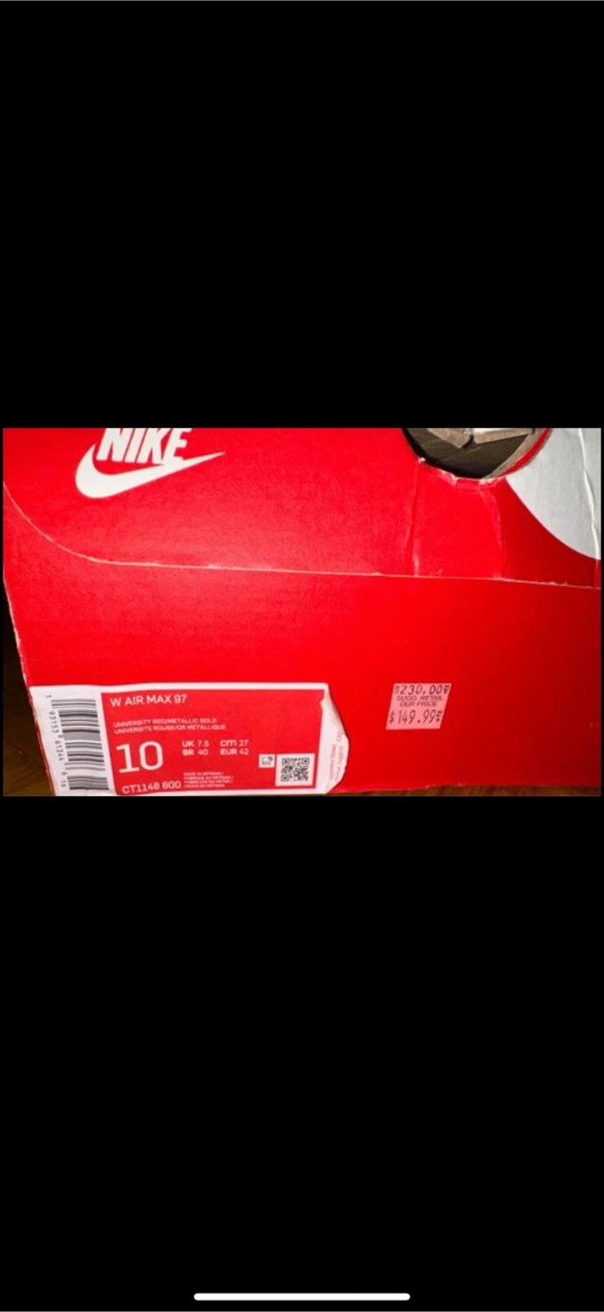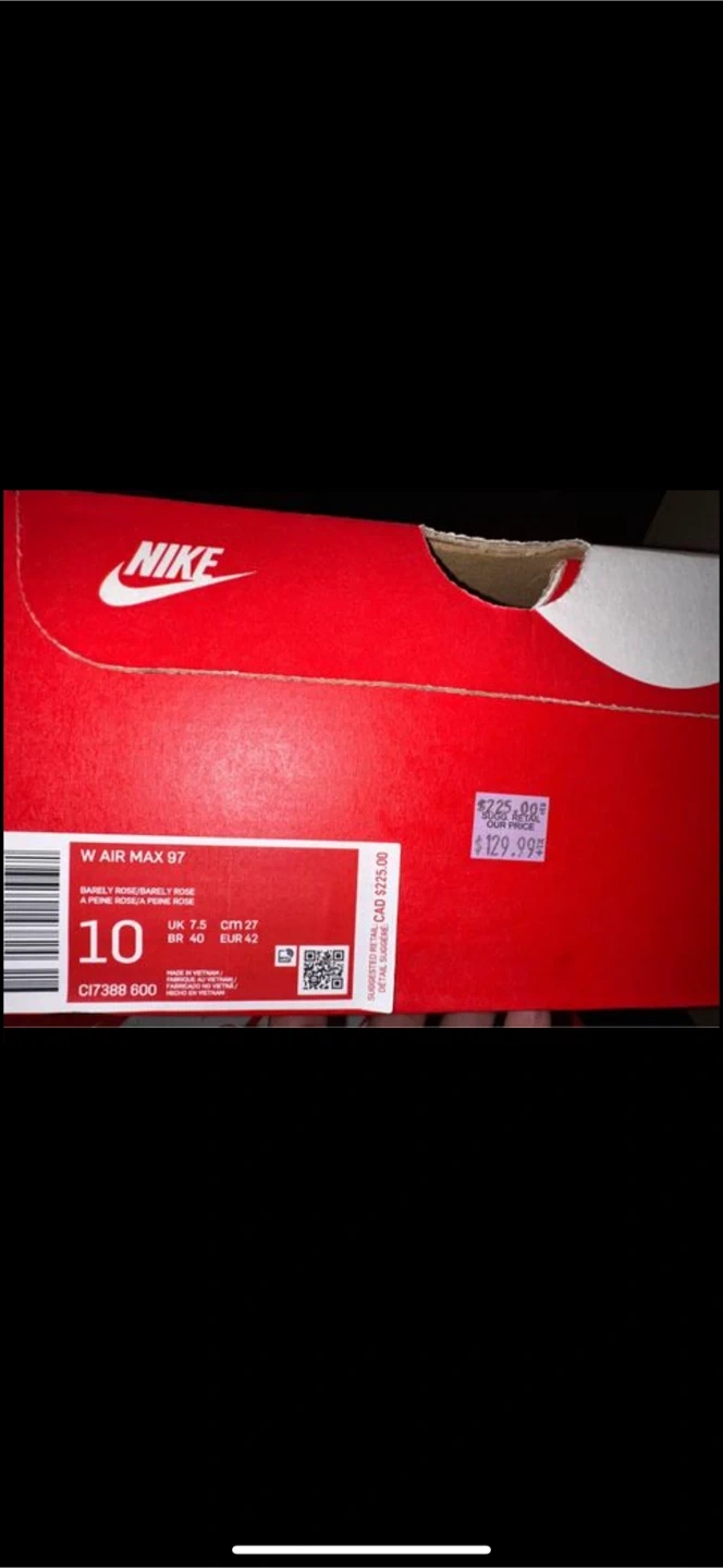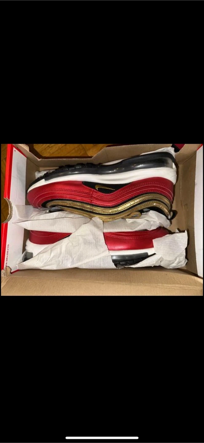 Selling a pair of Nike W Air Max 97 sneakers in size 10. They come with the original box. One pair is Barely Rose/Barely Rose, and the other is University Red/Metallic Gold