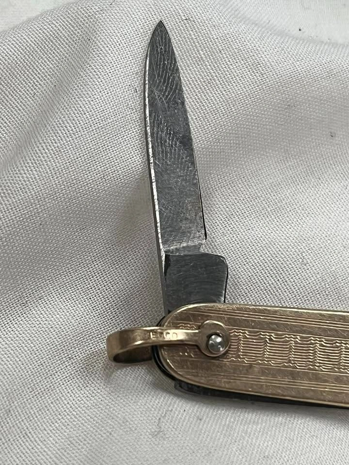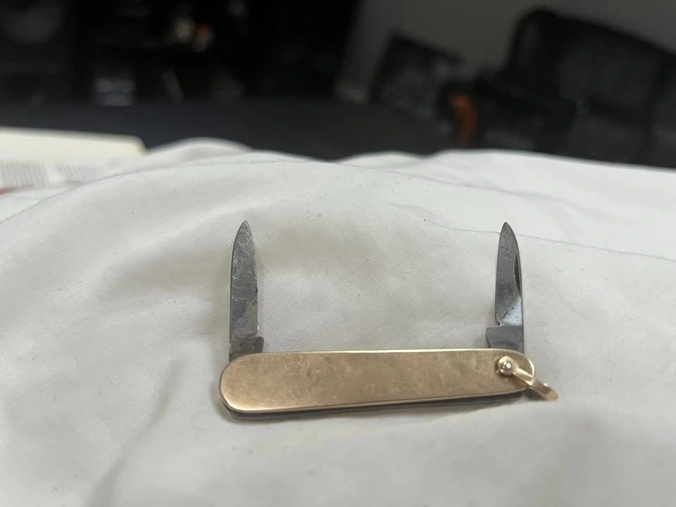 Selling a vintage handmade Inekut pocket knife. It's a unique piece with a gold-tone handle and 2 Stainless Steel blades. Shows some signs of wear, but still in good condition for its age!