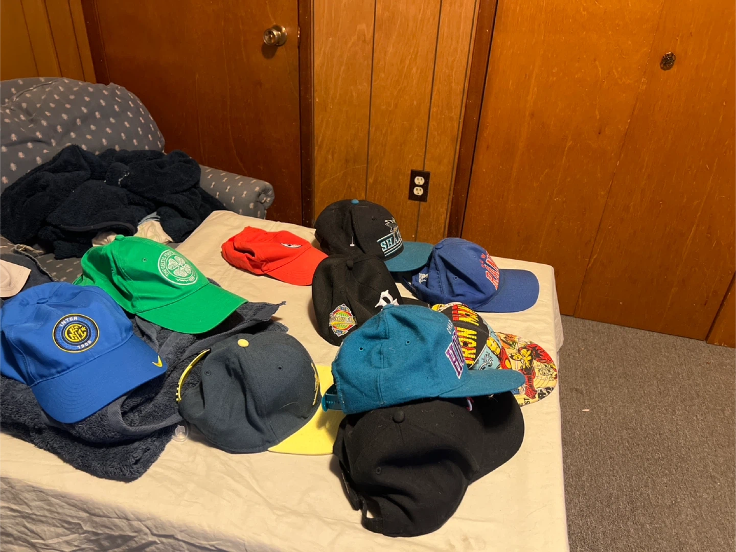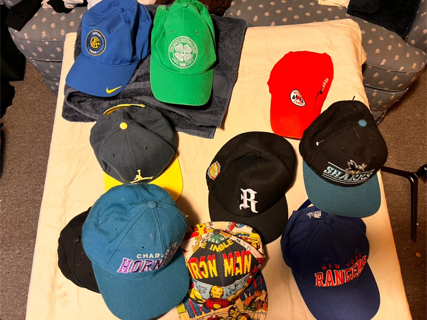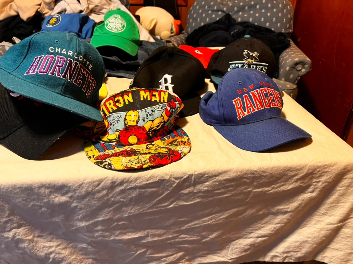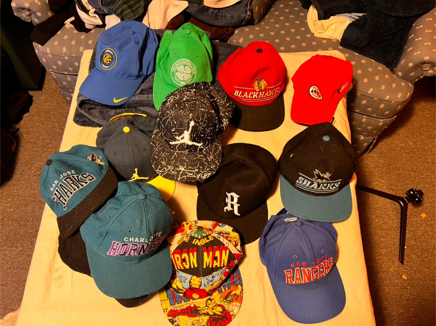 Selling a collection of baseball caps. There's a variety of styles and teams, including Nike, Iron Man, Charlotte Hornets, NY Rangers, Chicago Blackhawks, San Jose Sharks, and more! They are in good condition and ready for a new home.