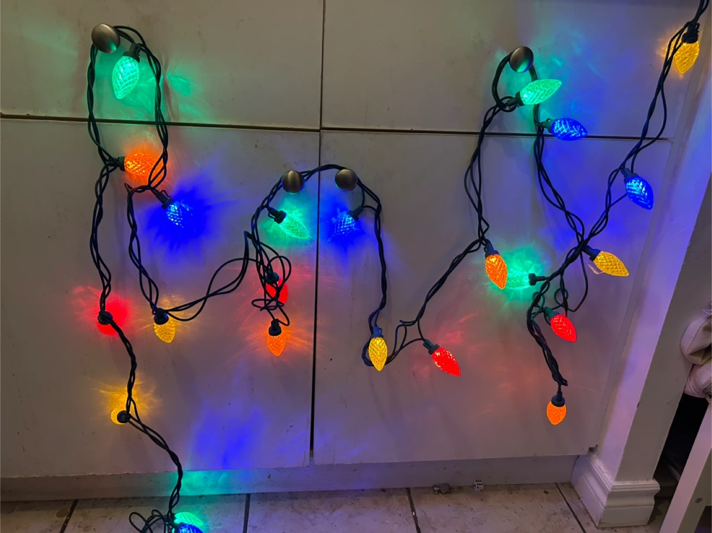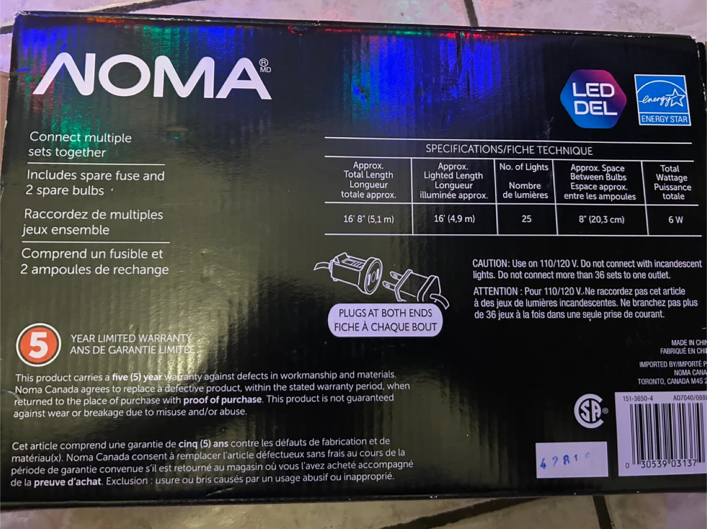 Selling a NOMA LED Christmas string lights! They're multi-coloured and perfect for indoor or outdoor use. The total length is 16'8" (5.1 m)