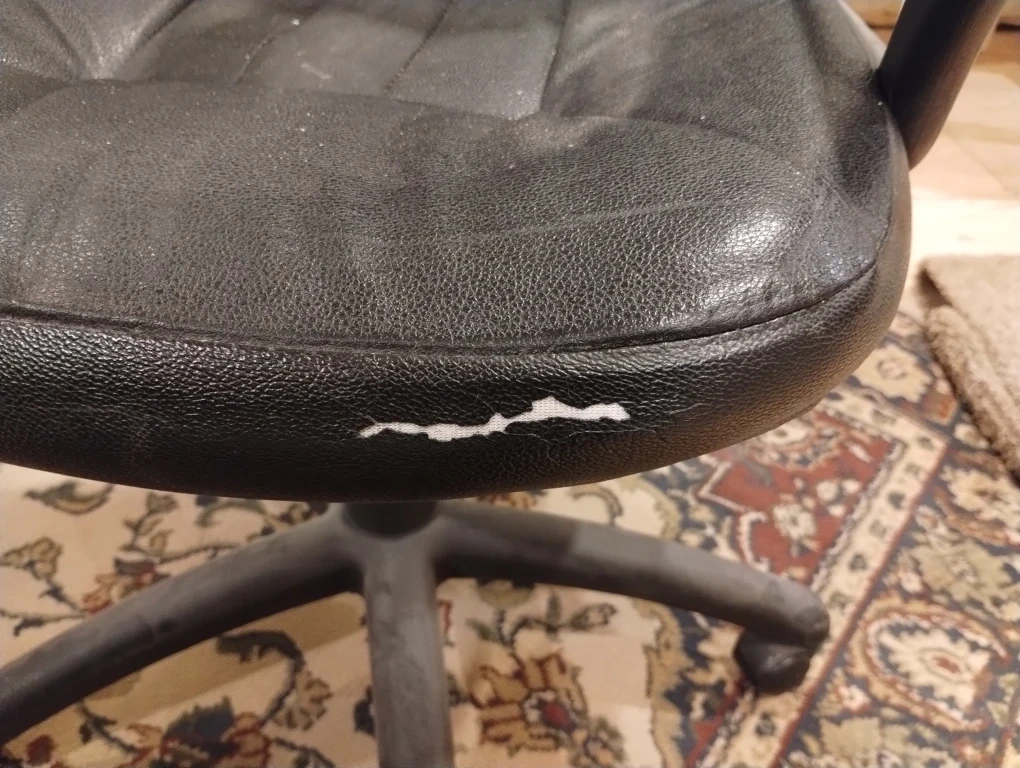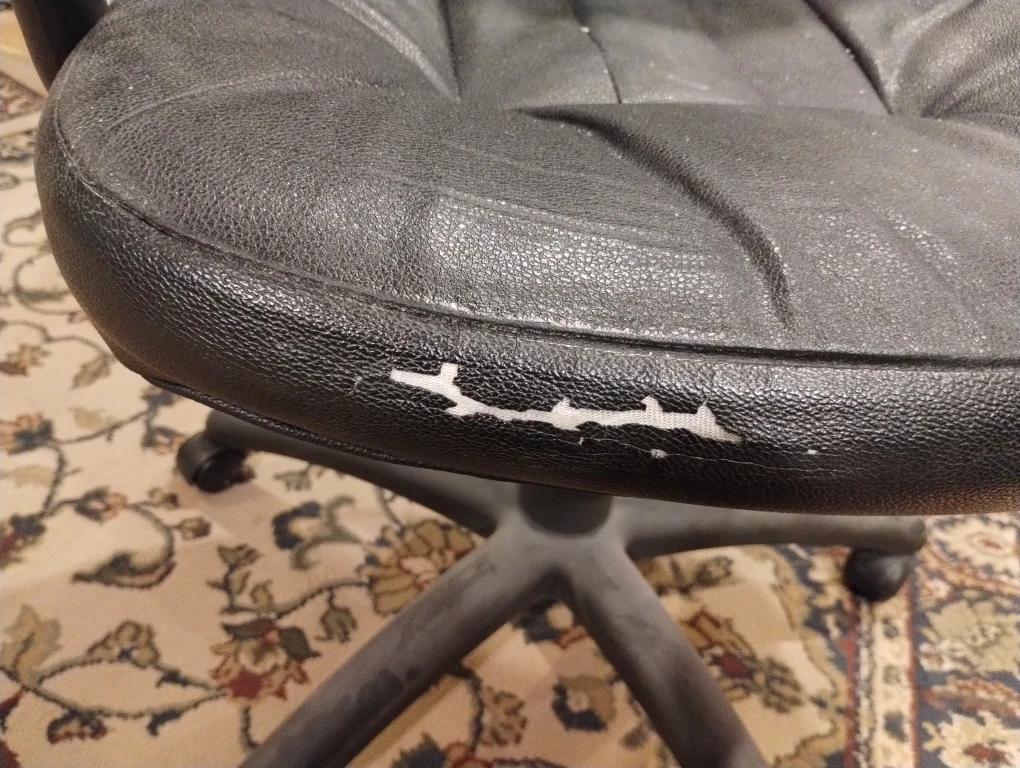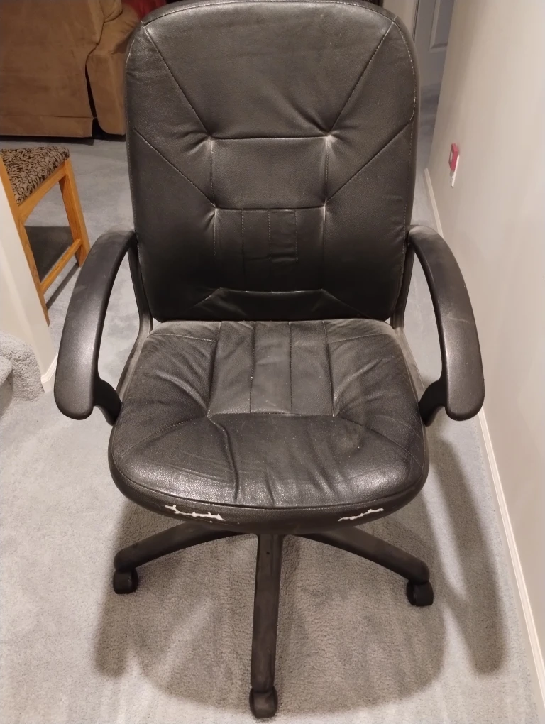 Selling a black vinyl office chair. It has some wear and tear on the seat, as shown in the pictures. Still a functional and comfortable chair for your home office or workspace.