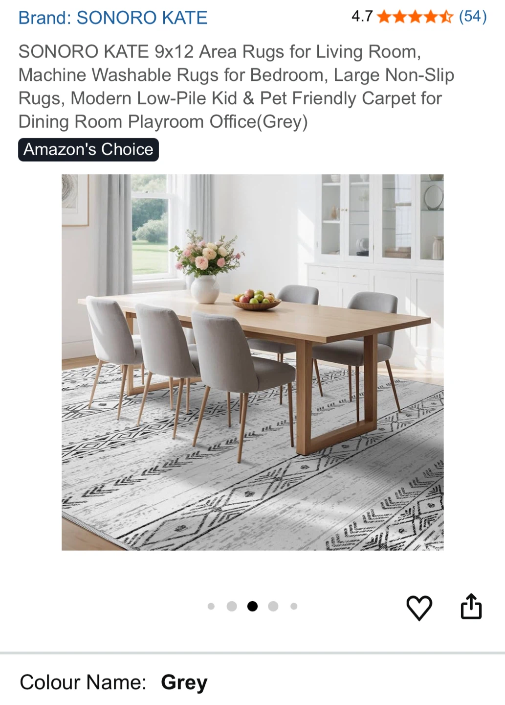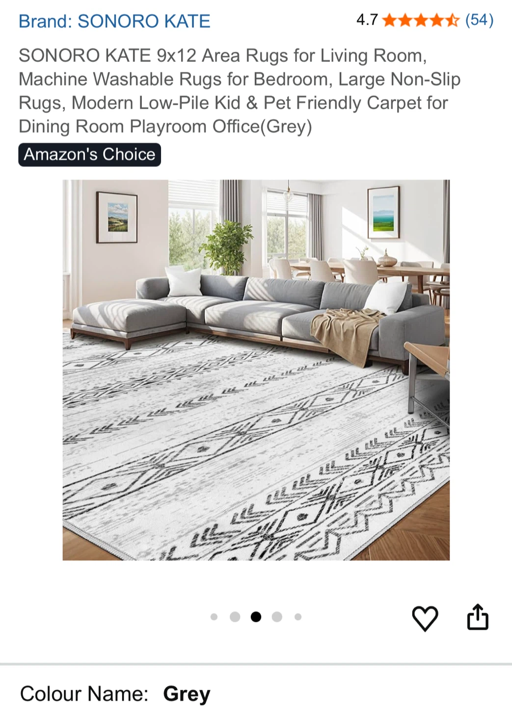 Selling a SONORO KATE 9x12 area rug, perfect for adding a touch of modern style to your living room, bedroom, or playroom! This machine-washable rug features a non-slip design and a low-pile construction, making it both kid and pet-friendly. The colour is a stylish grey, and it's in great condition.