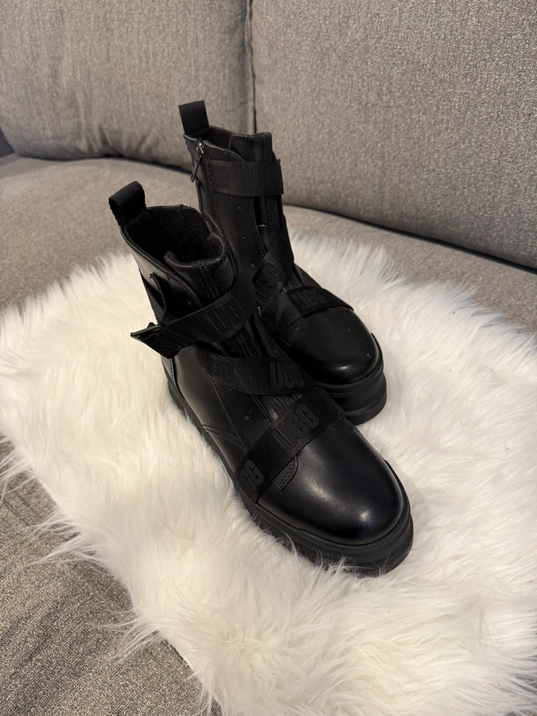 These UGG boots are perfect for adding a bit of edge to your look! They're a sleek black leather and in great condition. Size 9