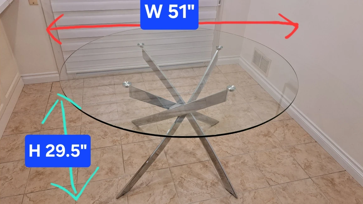 Selling a glass dining table. The table's dimensions are approximately 51 inches in width and 29.5 inches in height.