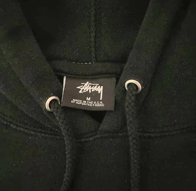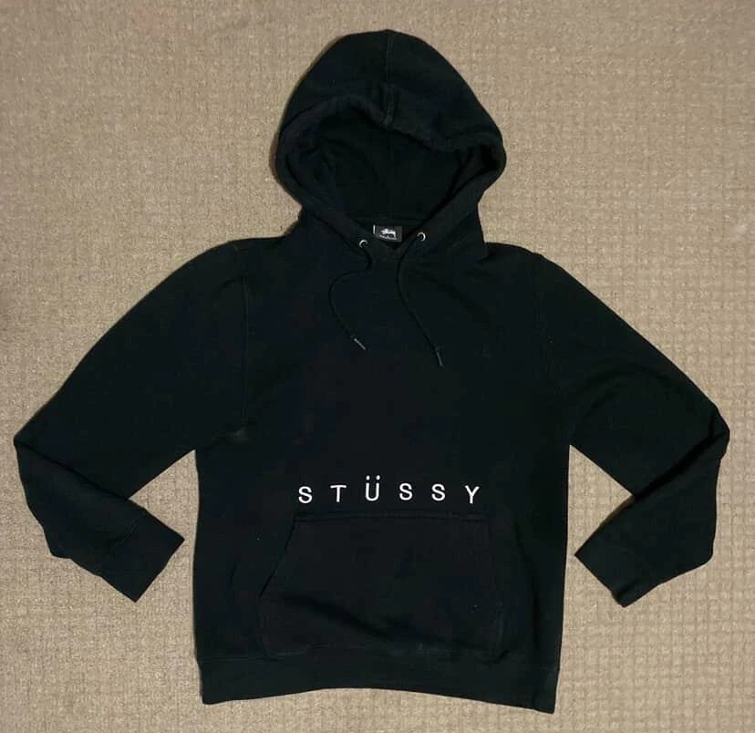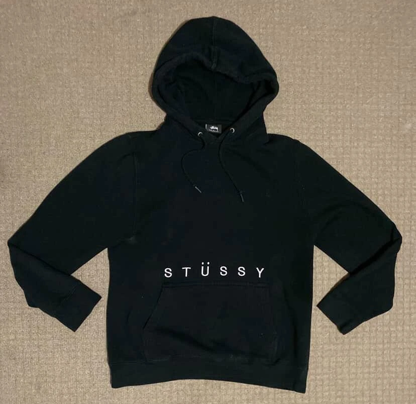 Selling a vintage embroidered Stüssy black hoodie in size medium. It's in decent condition .