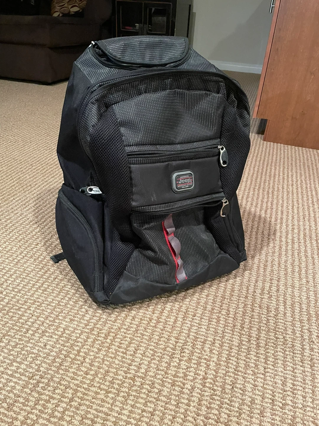 This is a Jeep rolling backpack in black. It's in great shape and ready for your next adventure or trip to school. It features a retractable handle and wheels for easy transport. It also has multiple compartments for organizing your belongings