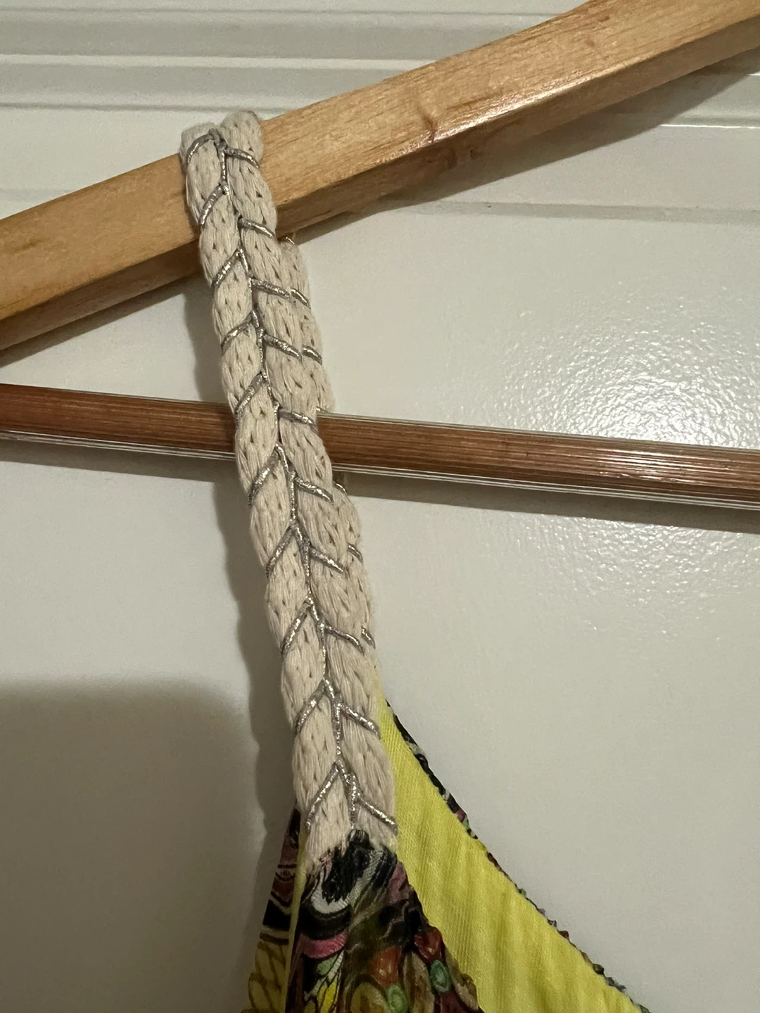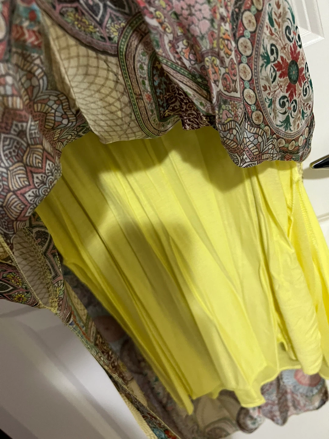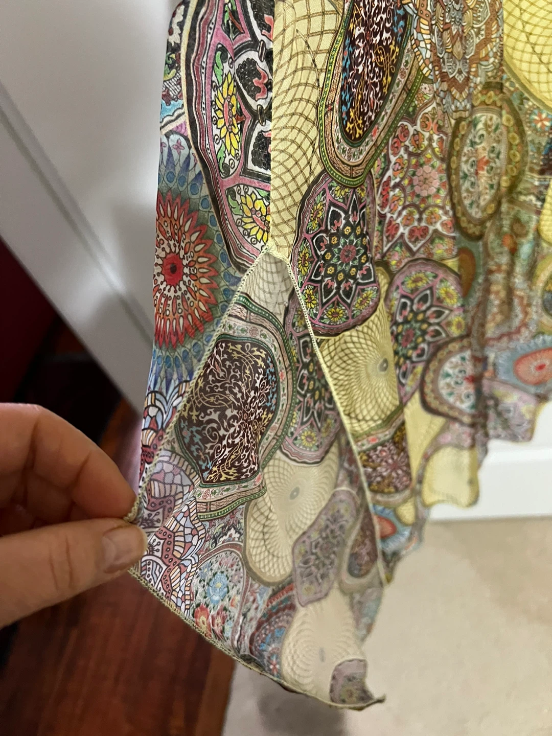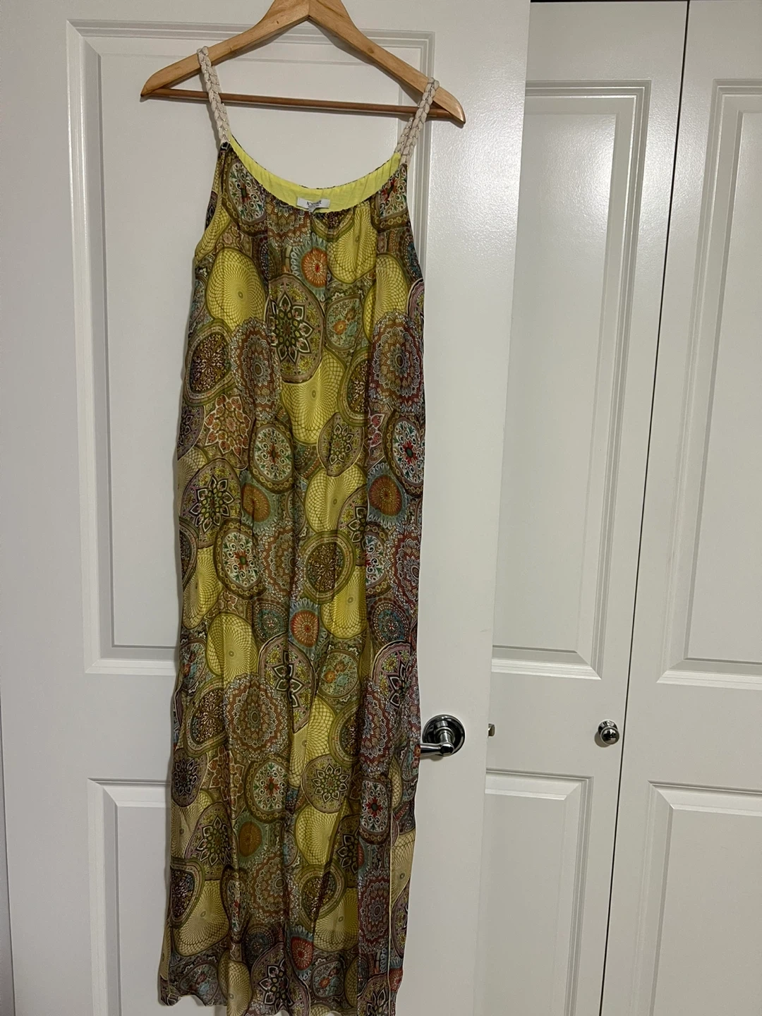 This is a beautiful dress from Rosemarine, made in Italy! It's a size M and features a unique, eye-catching pattern. The material composition is 70% viscose, 30% silk, with a lining of 95% viscose and 5% elastane