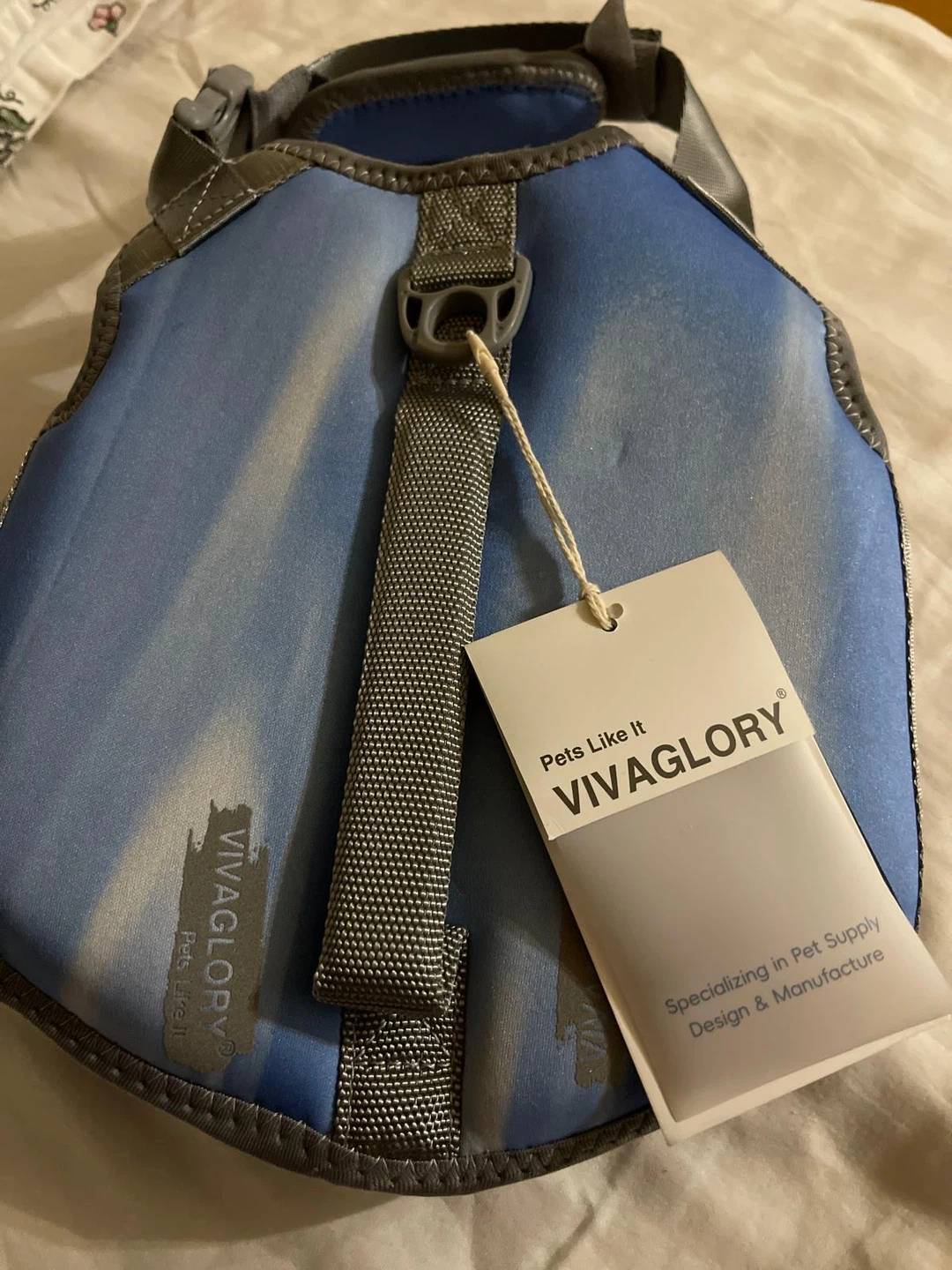 Selling a VIVAGLORY pet life jacket in size small. It's in great condition and ready for your furry friend's next water adventure! The jacket is blue and grey.