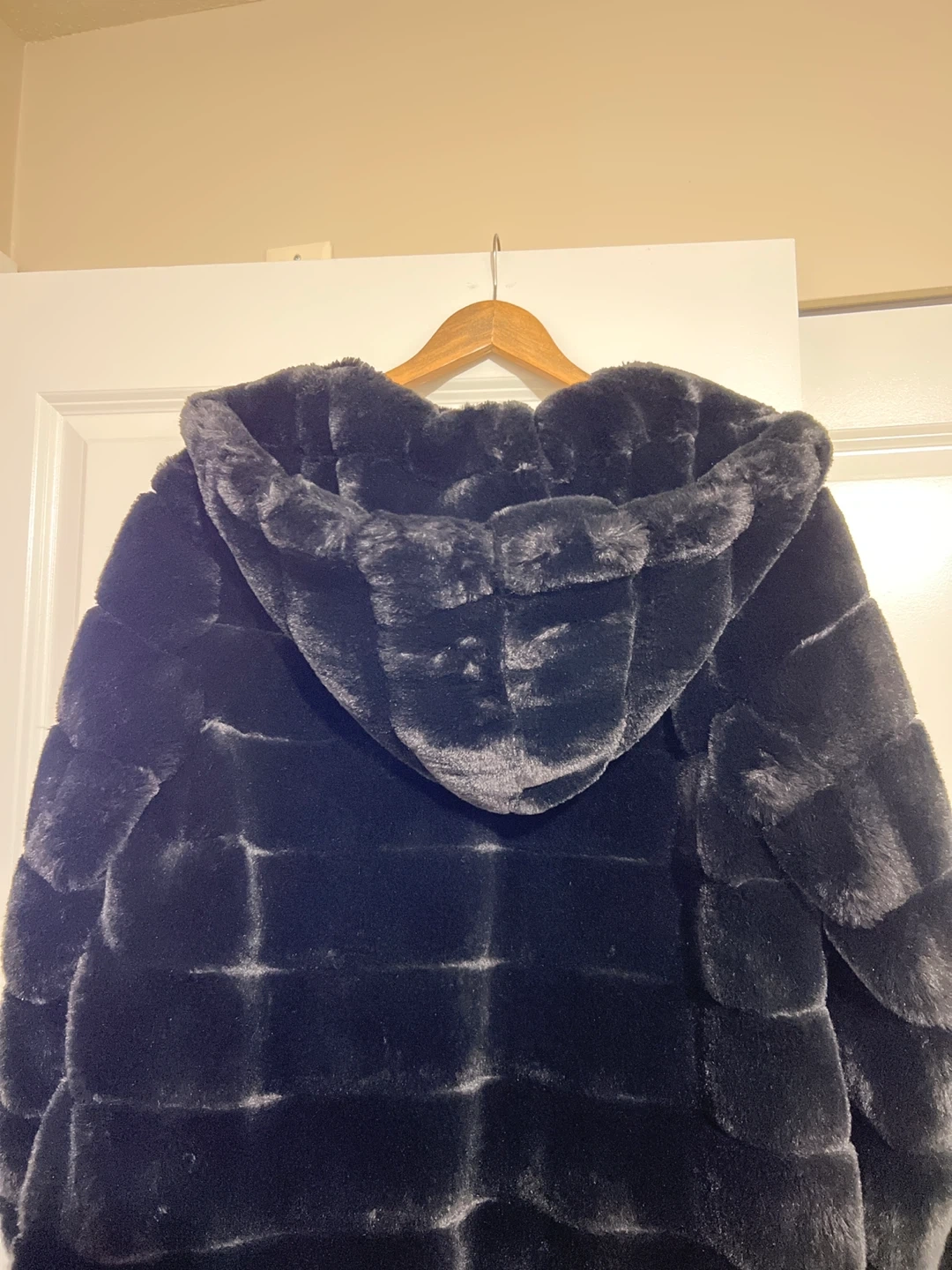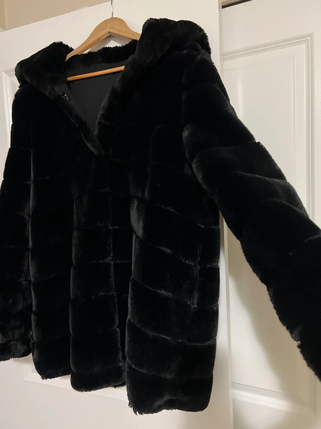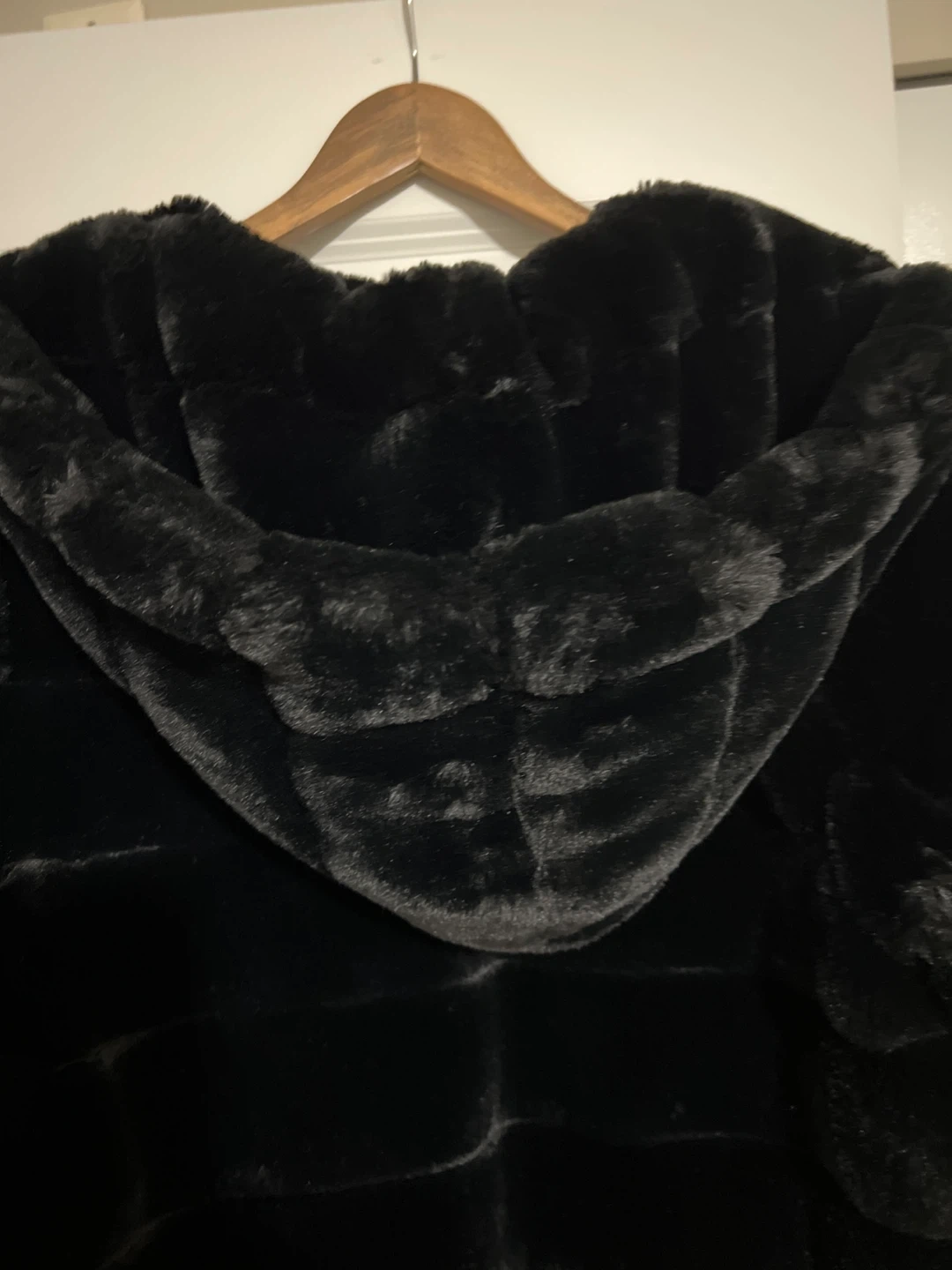 Selling a cozy black faux fur coat with a hood. It's in great condition and perfect for staying warm and stylish during the colder months. It has a soft lining and a comfortable fit. Feel free to ask any questions!