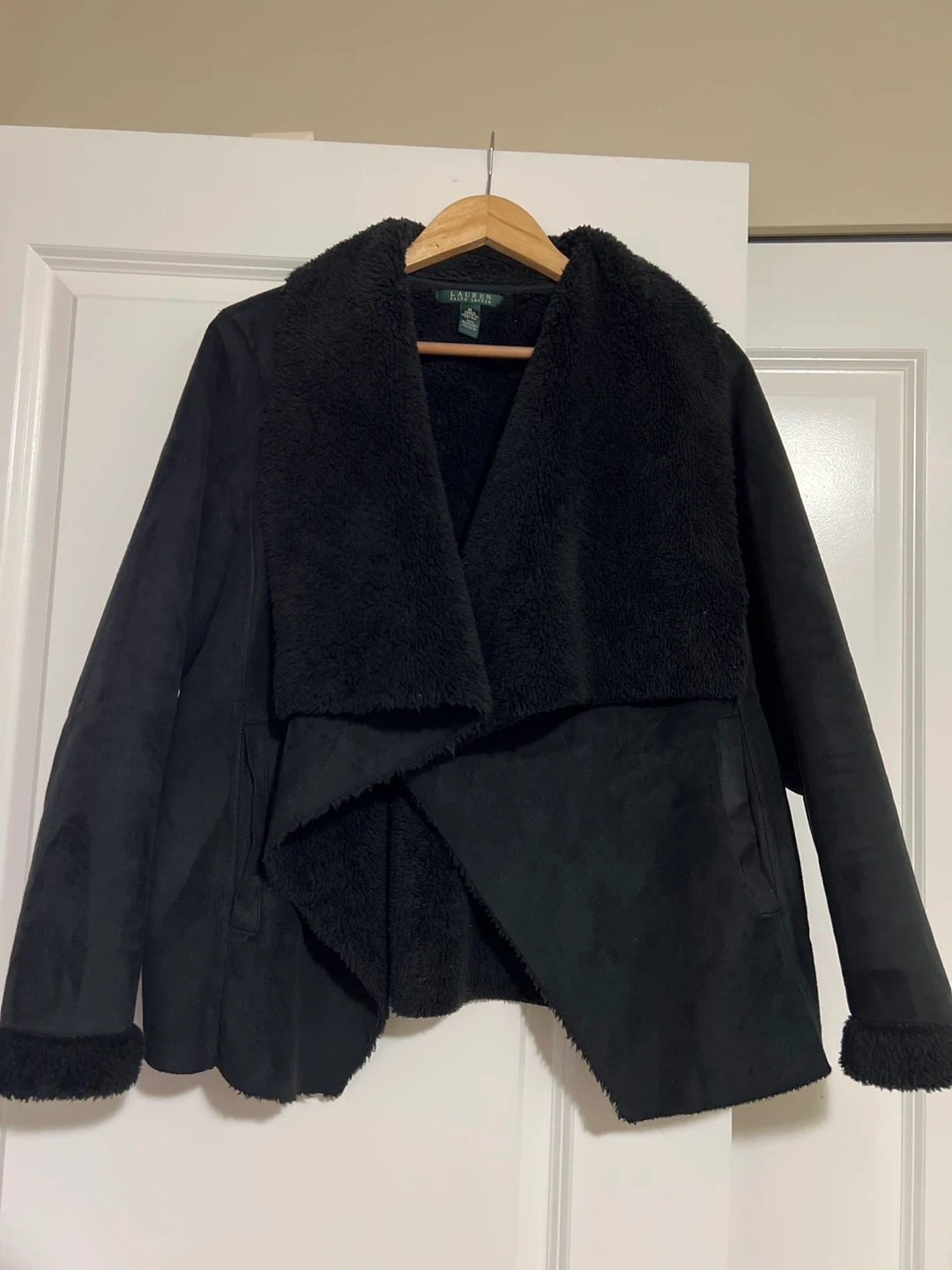 Cozy Ralph Lauren jacket in a women's size medium! This stylish jacket features a combination of faux suede and faux fur, making it perfect for adding a touch of warmth and elegance to any outfit. It's in great condition and ready for a new home