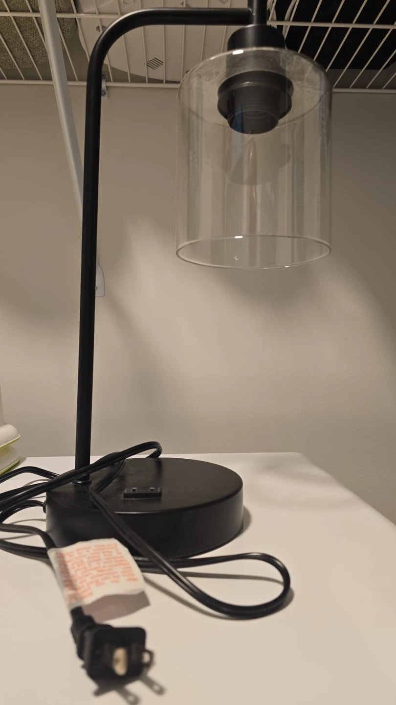Selling a simple and stylish black table lamp! It features a clear glass shade that provides a nice ambient light. Perfect for a bedside table or desk!It also has a port to charge your phone.