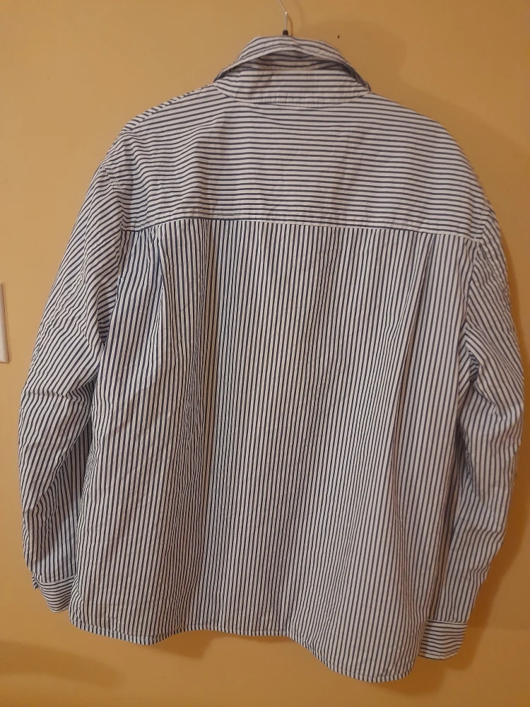 Here's a striped button-up shirt that's ready for a new home! It features a classic design with vertical stripes and a front pocket. Perfect for casual wear or layering