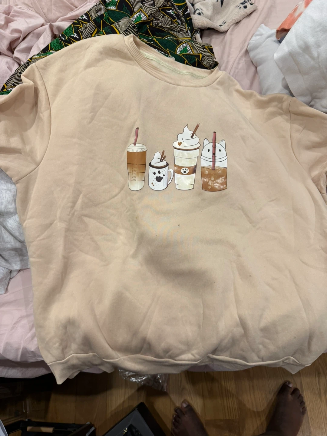 Selling a super cute sweatshirt with a graphic of various coffee drinks! It's a light beige color and in great condition. Perfect for coffee lovers!