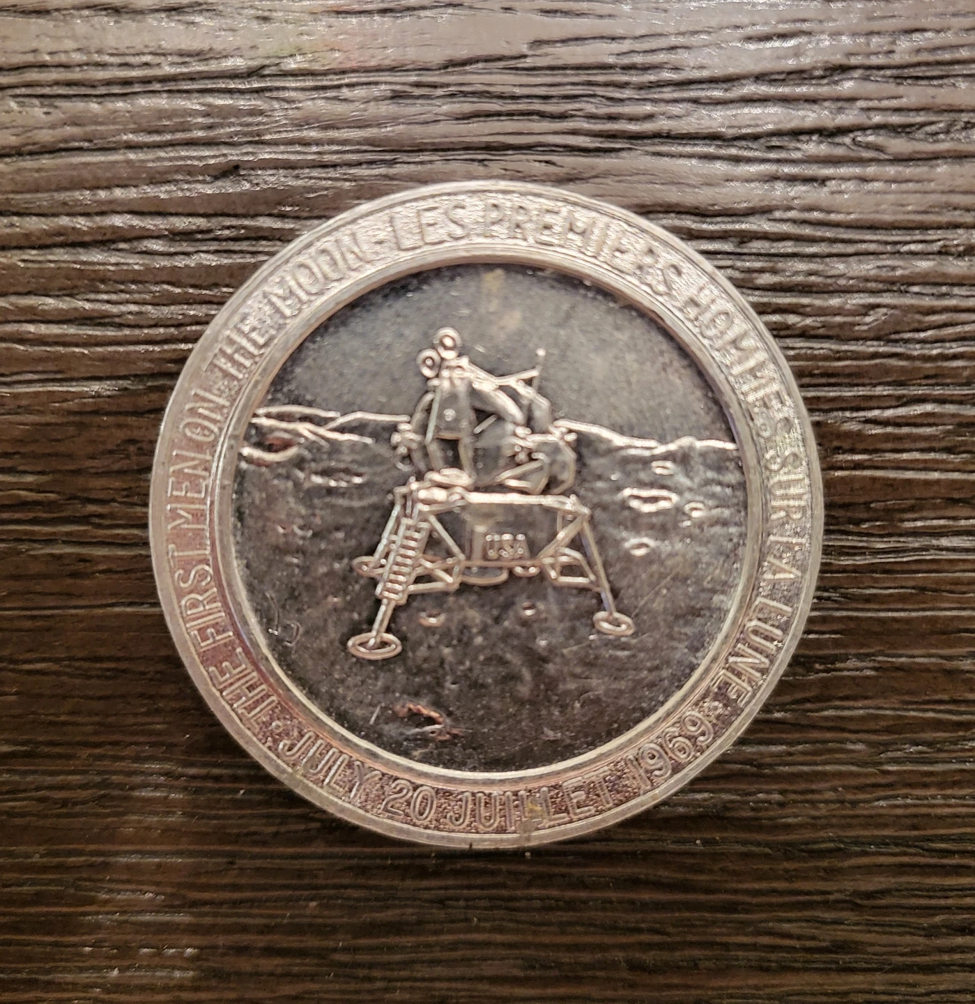 Commemorative aluminum token celebrating the Apollo 11 mission and the first men on the moon, July 20, 1969. Features the lunar lander on one side and portraits of Aldrin, Armstrong, and Collins on the other.