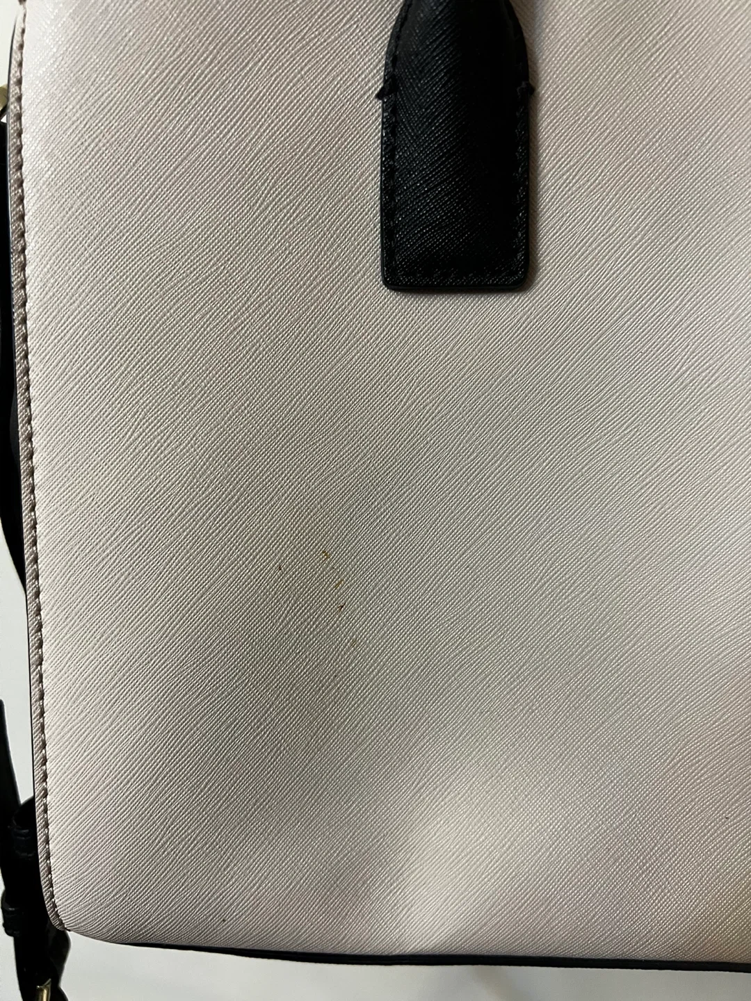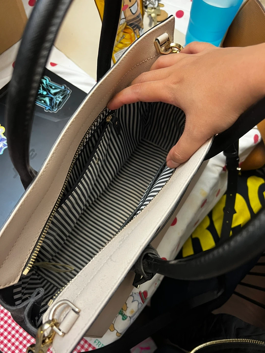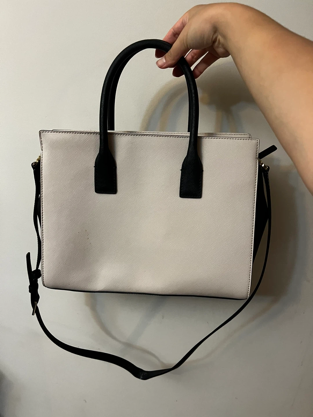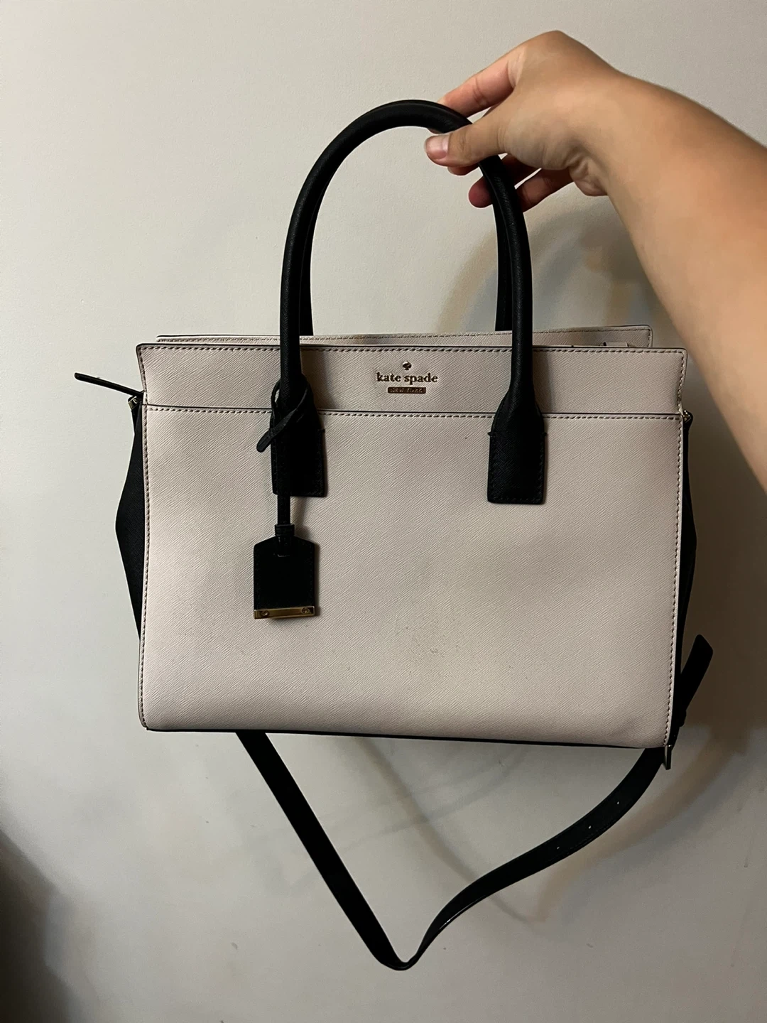 Selling a Kate Spade satchel in beige and black. In good condition- gifted to me and was never used. Comes with original dust bag. Perfect for everyday use. There are some super minuscule marks on the back that can probably be scrubbed off, as shown in the photos, and price is adjusted to reflect that. The interior has a cute striped lining