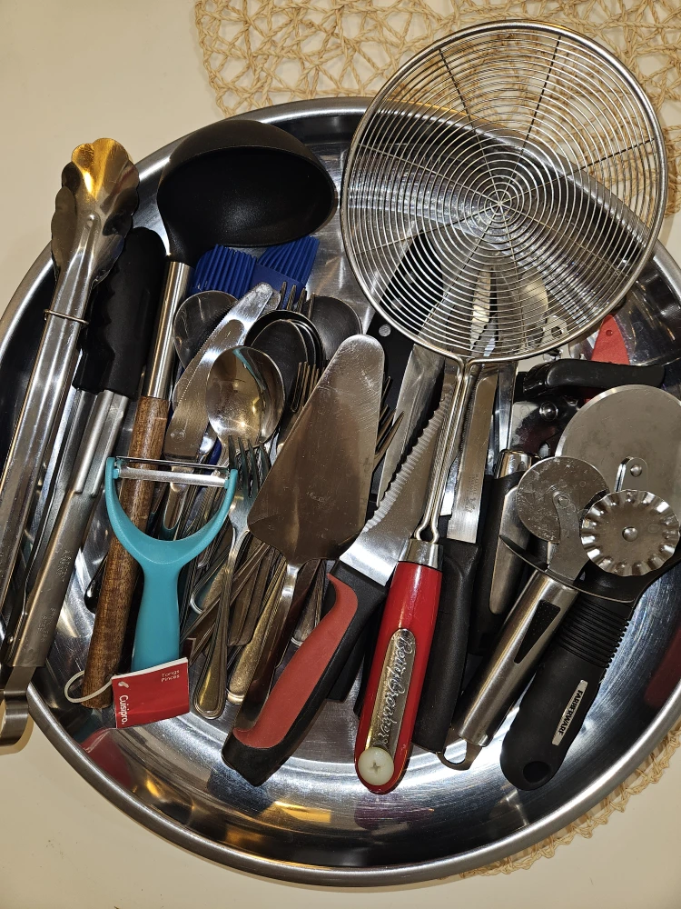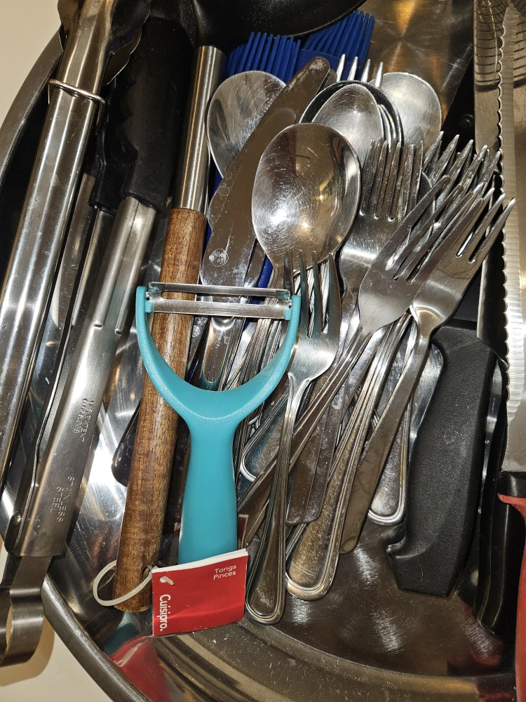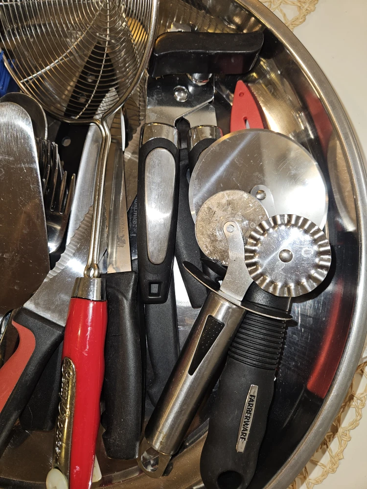 Selling a collection of various kitchen utensils. Includes spoons, knives, peelers, pizza cutters, can opener, barbecue stuff and more! Everything you need to whip up a great meal is here.