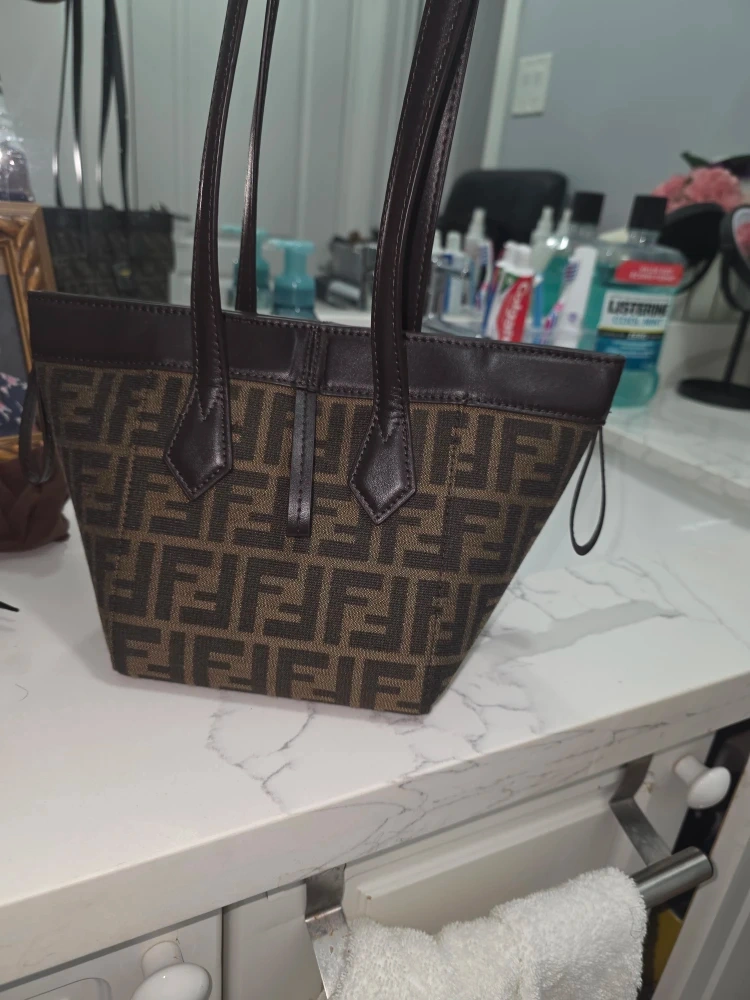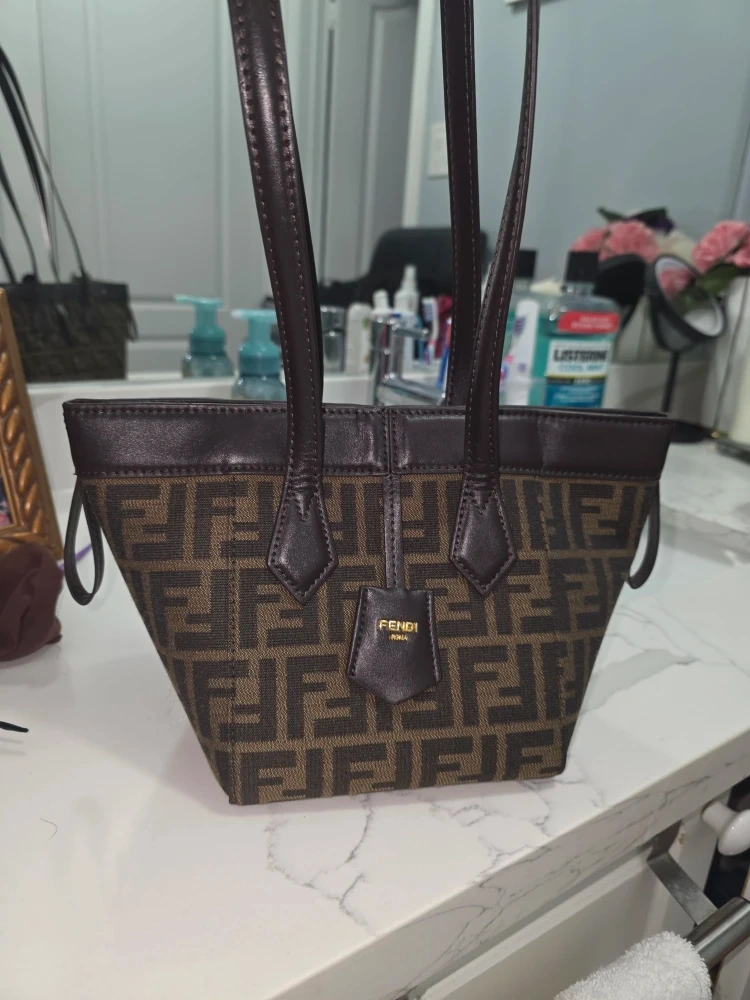 Here's a cute Fendi mini tote bag up for grabs! It features a classic Pequin pattern in brown tones. The bag is in great shape and perfect for carrying your essentials.