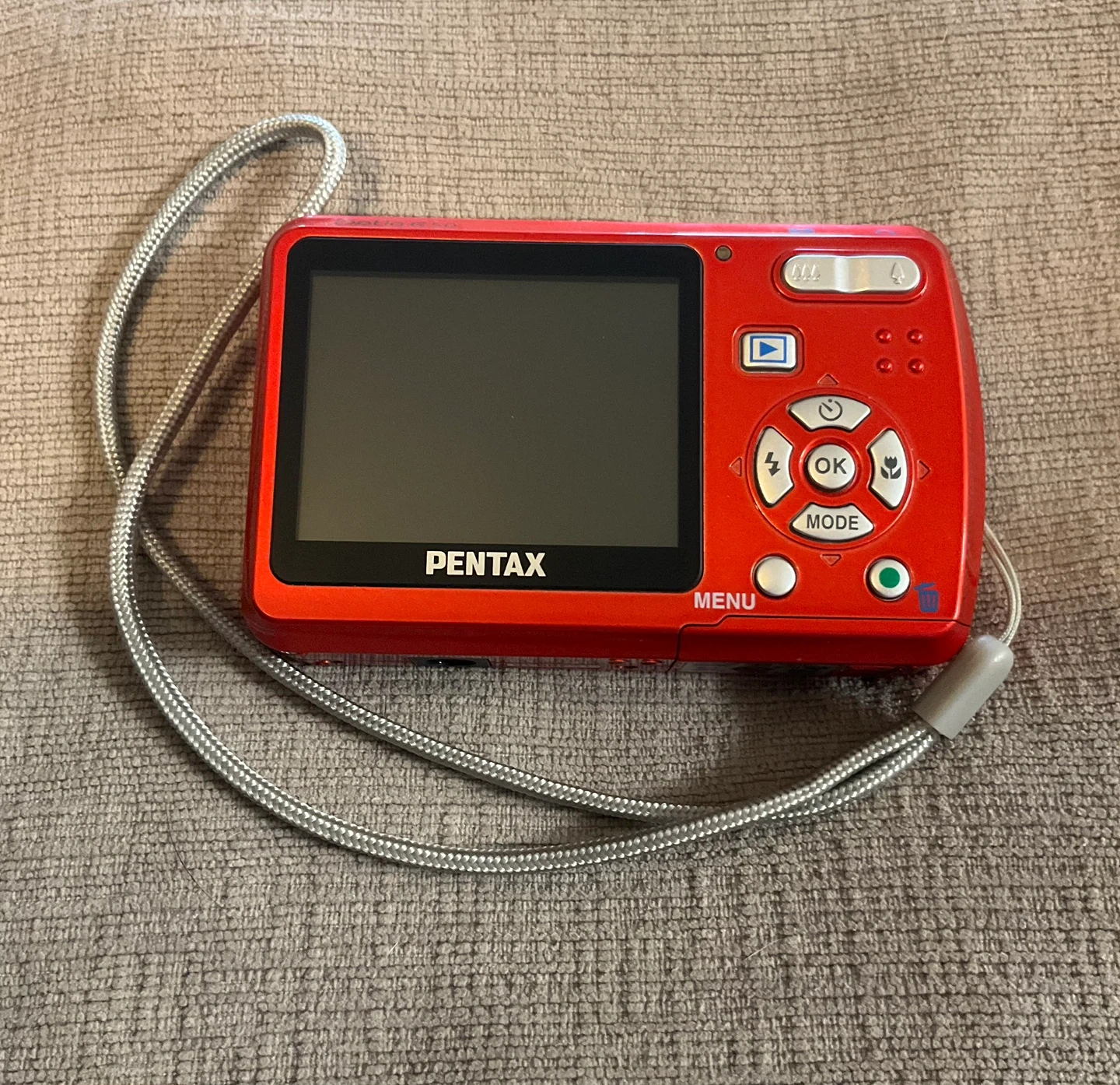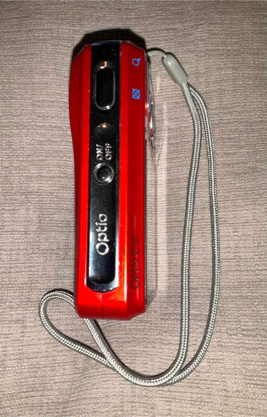 Selling a red Pentax Optio E50 digital camera with 8.1 megapixels. It's a compact camera perfect for everyday use. It has a 3x optical zoom. Great for capturing memories! Does not include memory card, box or manual.