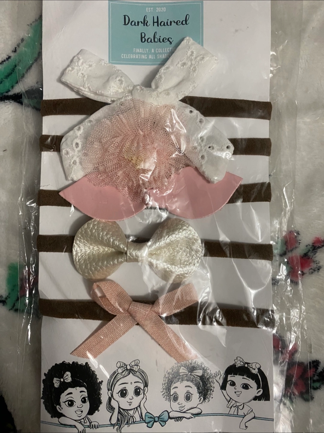 Selling a brand new set of Dark Haired Babies headbands! This set is a collection celebrating all shapes and sizes, perfect for your little one
