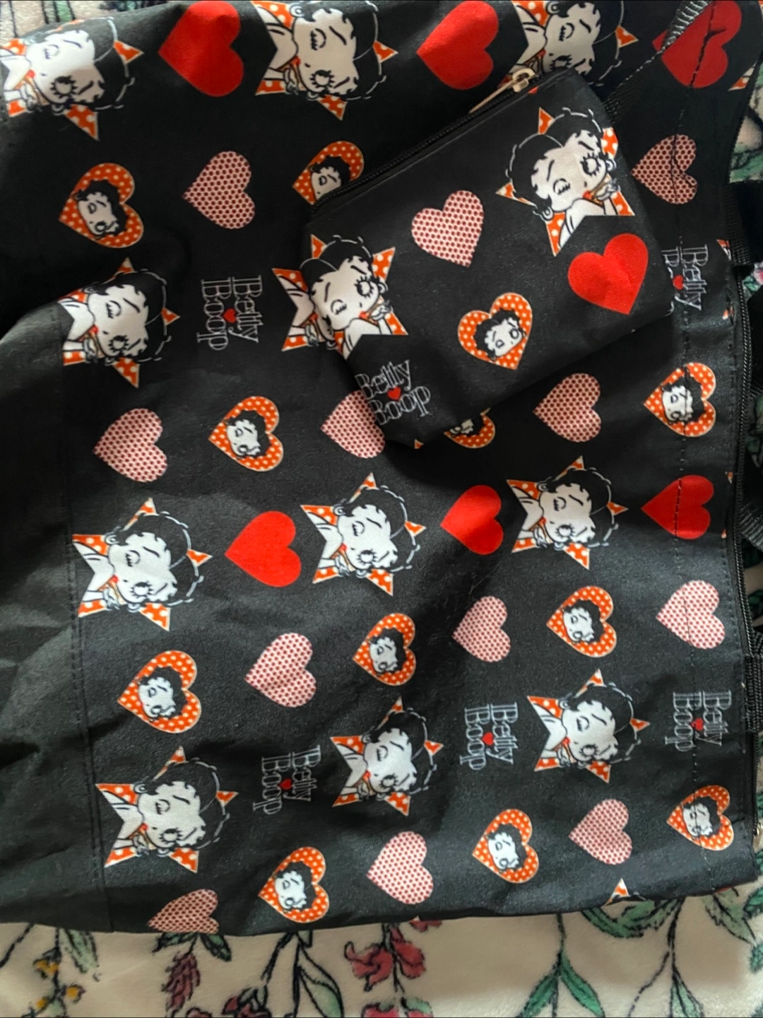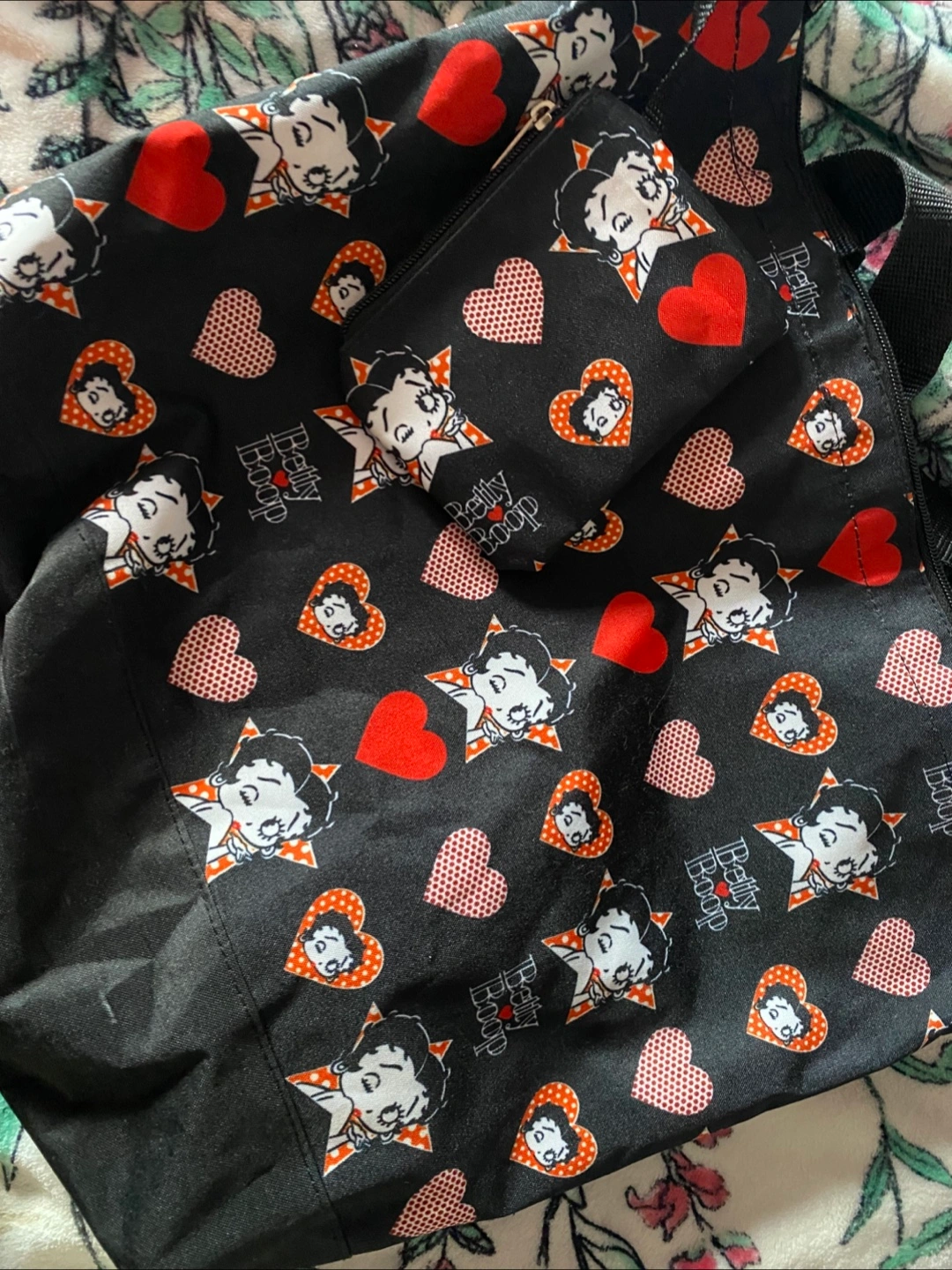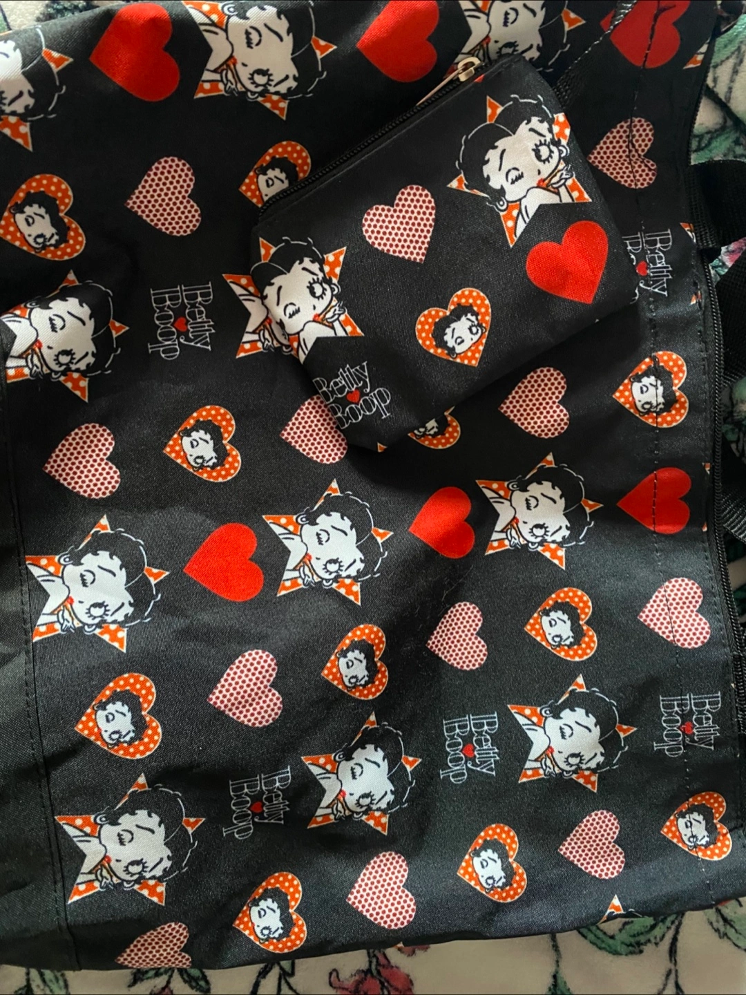 Super cute Betty Boop tote bag with a matching coin purse! The bag is black with a fun pattern of Betty Boop, hearts, and stars. Perfect for carrying your everyday essentials in style