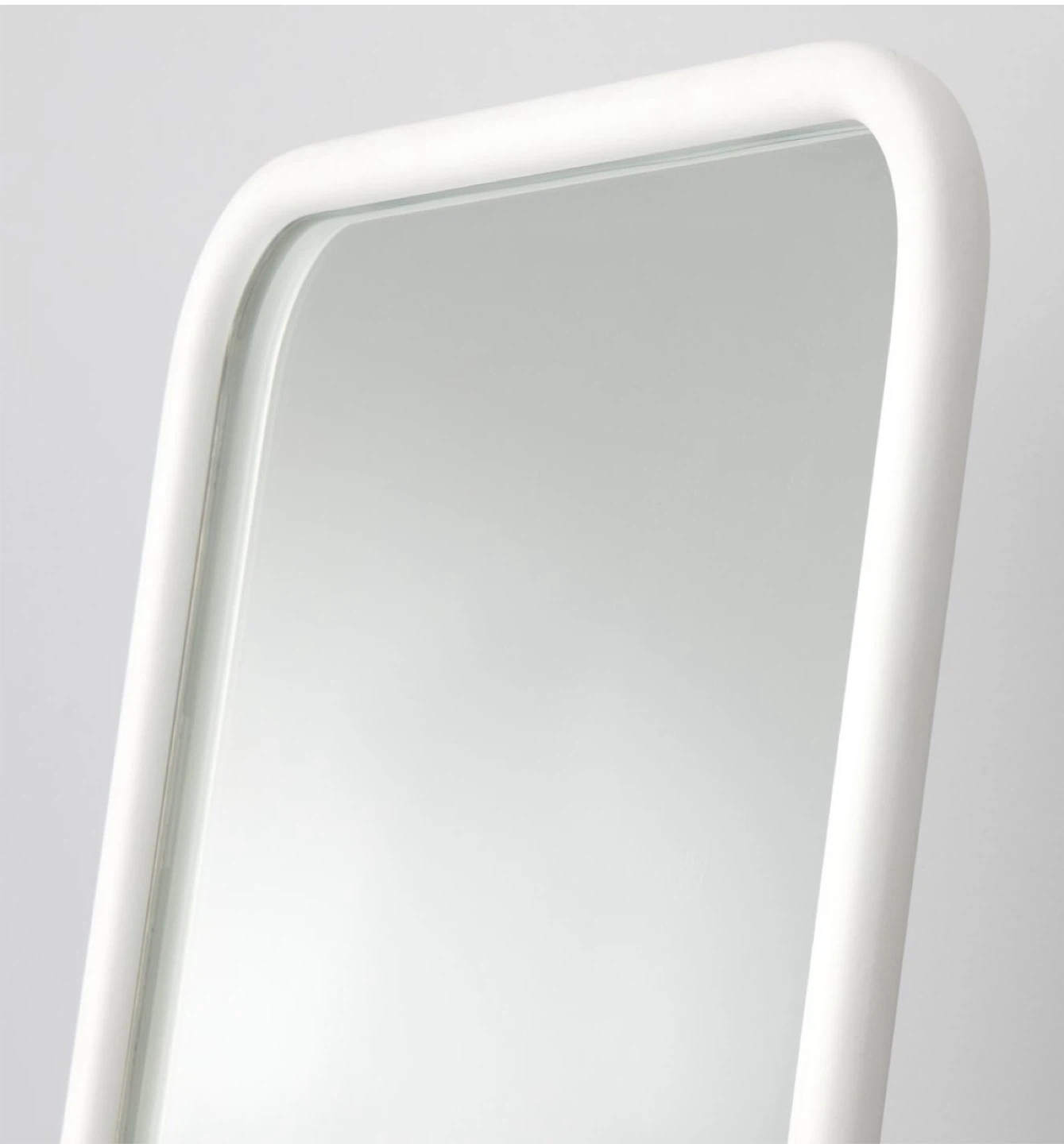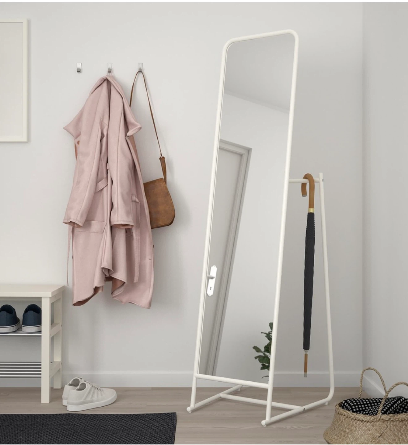 Selling an IKEA KNAPPER standing mirror in white. It's a great full-length mirror that also has hooks on the back for hanging clothes or accessories. Perfect for a bedroom or dressing area!