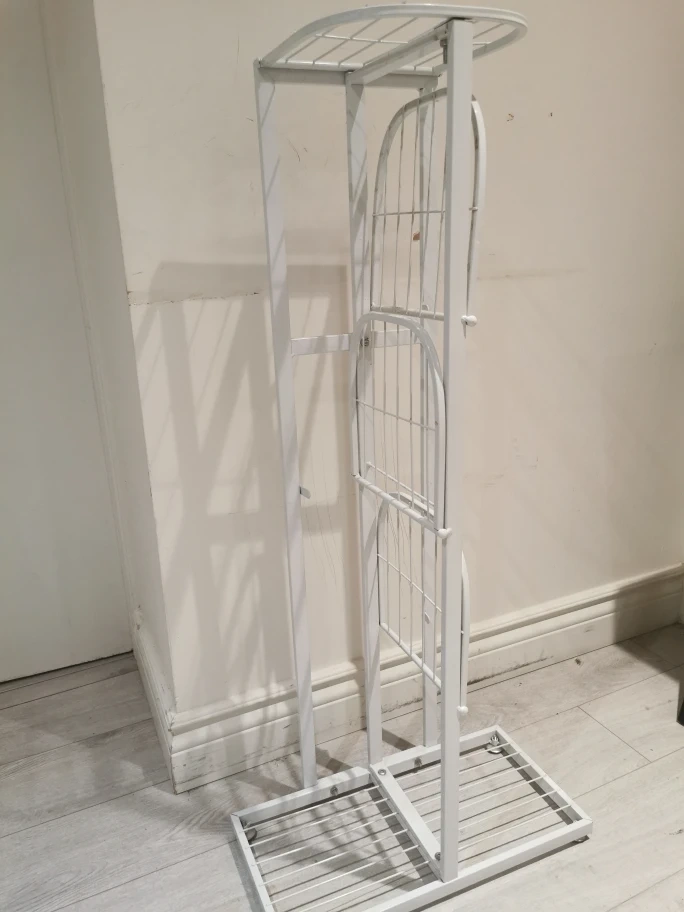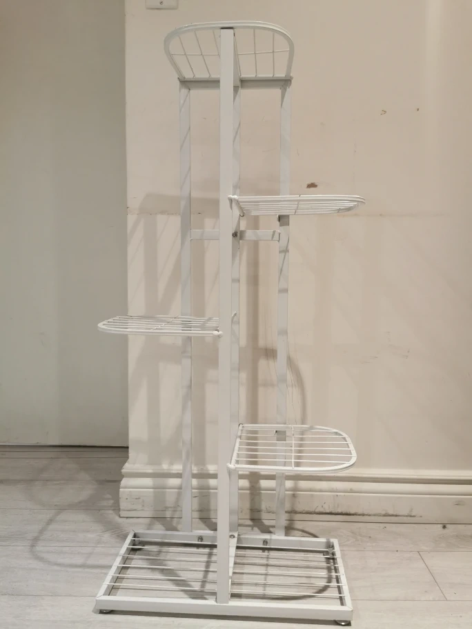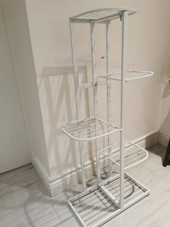 Selling a white metal plant stand. It's in great shape and ready to display your favourite plants. It has multiple tiers for different sized plants, making it a stylish addition to any room