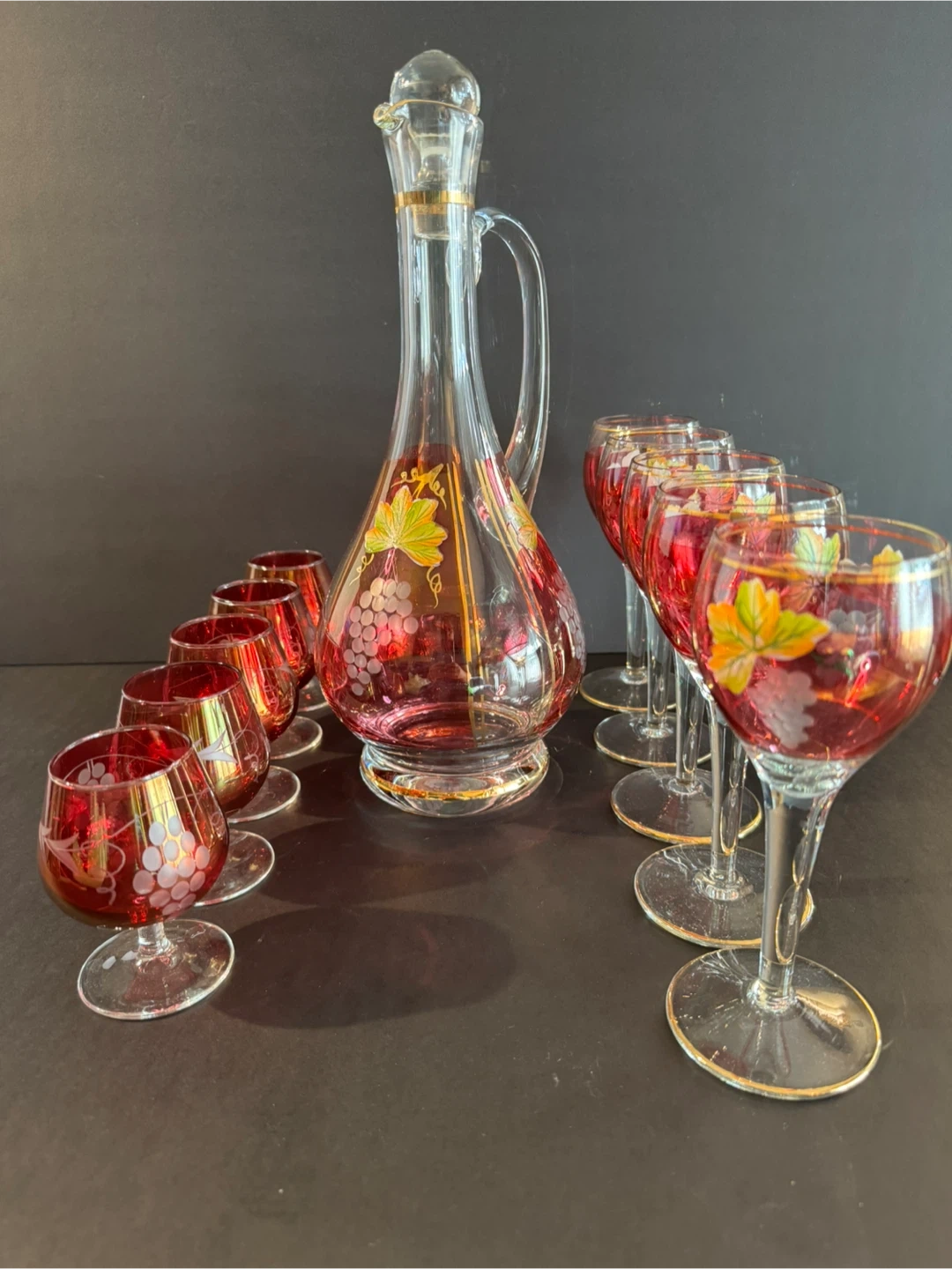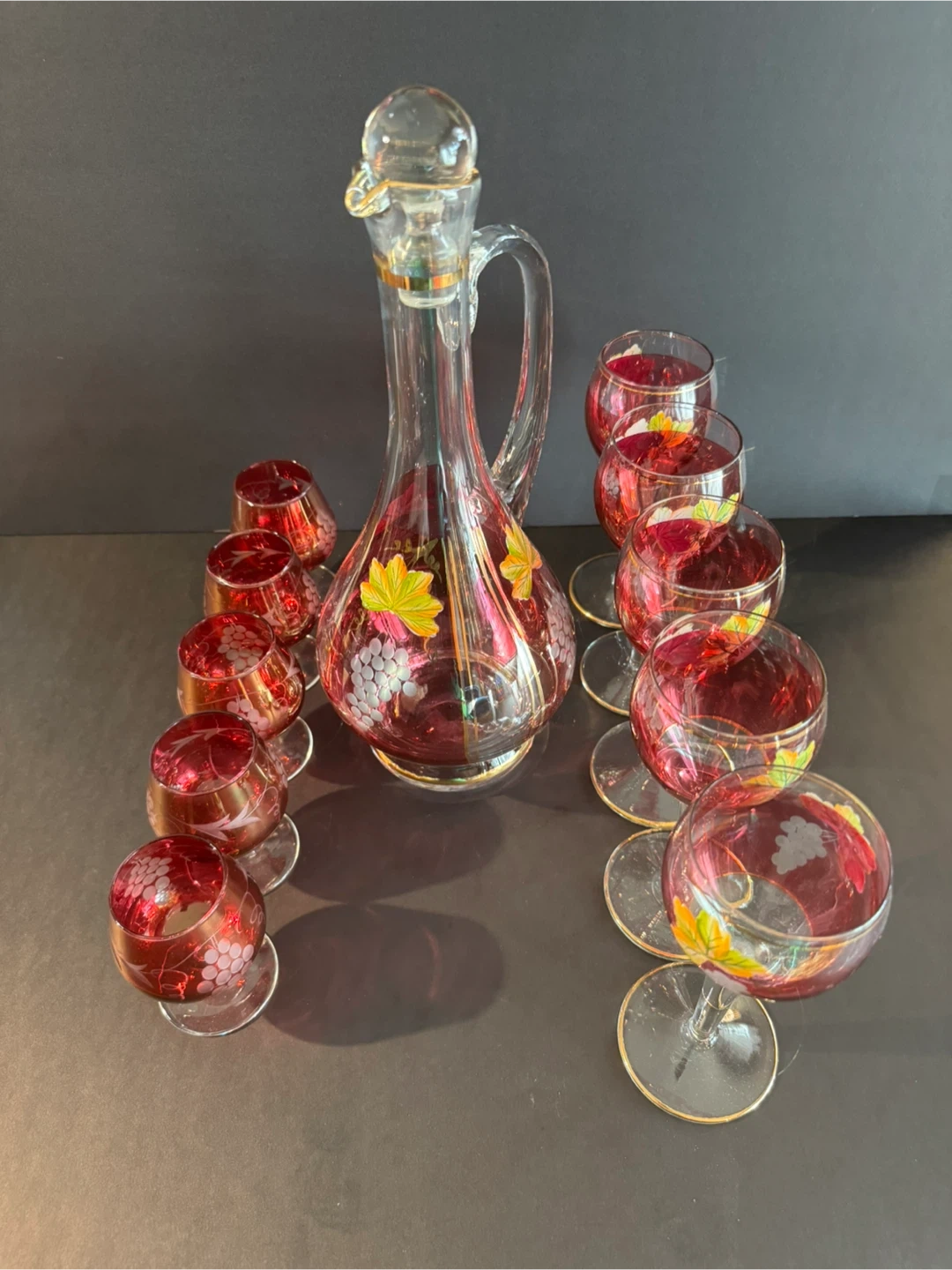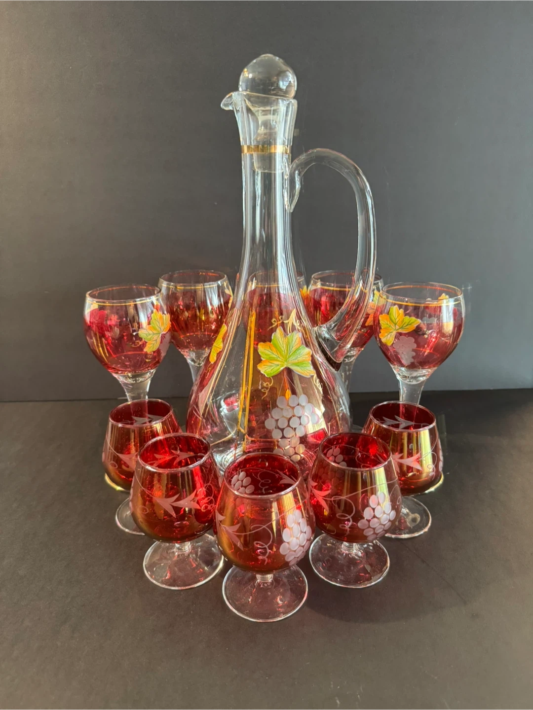 Beautiful vintage wine decanter set featuring a decanter and 10 matching glasses. The set is clear with red accents and a grape and leaf design. Perfect for adding a touch of elegance to your home bar or for special occasions!