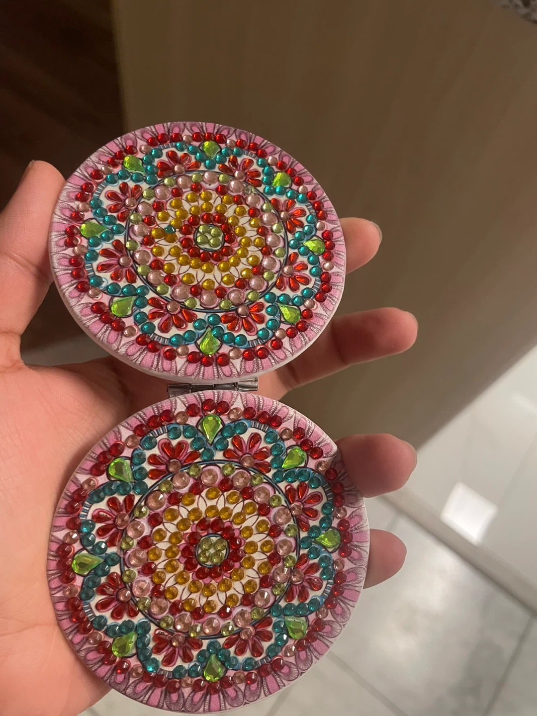 Selling a cute compact mirror with a colourful handmade jewelled design! It's new and perfect for on-the-go touch-ups
