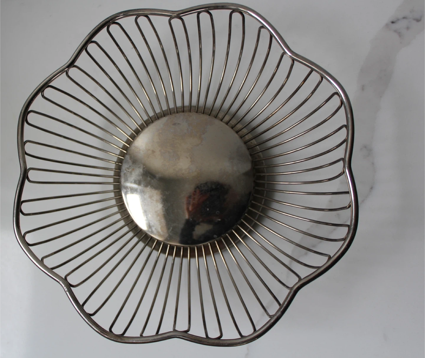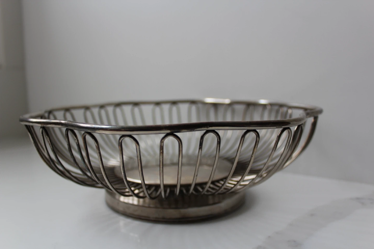 Here's a lovely vintage silver metal wire fruit bowl! It's in good condition and would look great on any table or countertop. It's a unique and stylish piece that's perfect for holding fruit or other decorative items