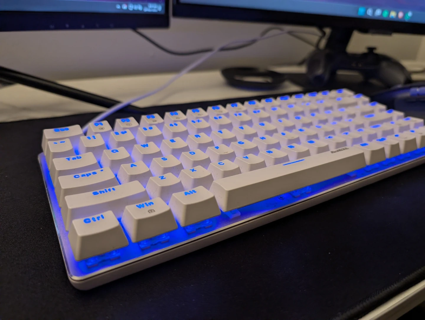 Selling an Ajazz AK33 82-key mechanical keyboard. It features a monochromatic backlight, perfect for gaming or office use. It has mechanical blue keys. It has 8 different light modes.