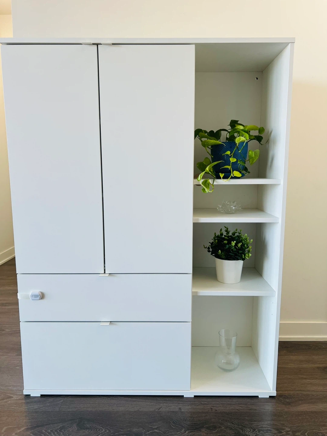 Selling a white wardrobe with both doors and open shelving! It’s a great storage solution for any room. The wardrobe features two doors, three drawers, and open shelves on one side.It can be used as pantry/wardrobe/storage unit. Easily assembled and disassembled .
