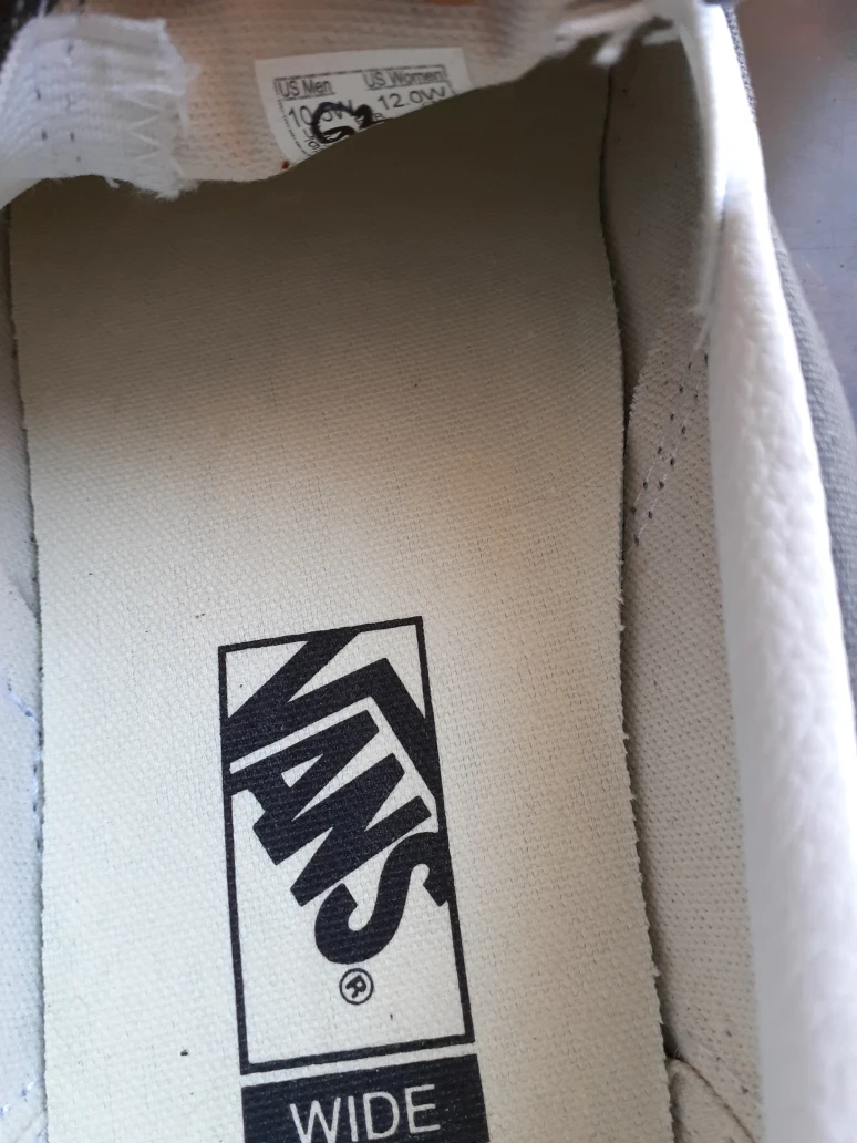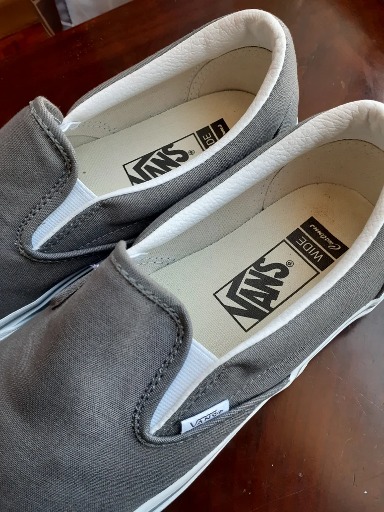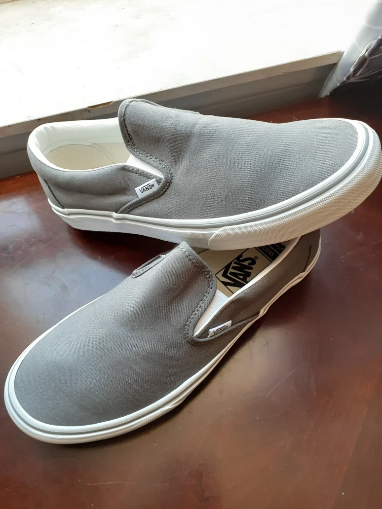 New pair of Vans slip-on in grey color, They are a men's US size 10.5 and have a wide fit,