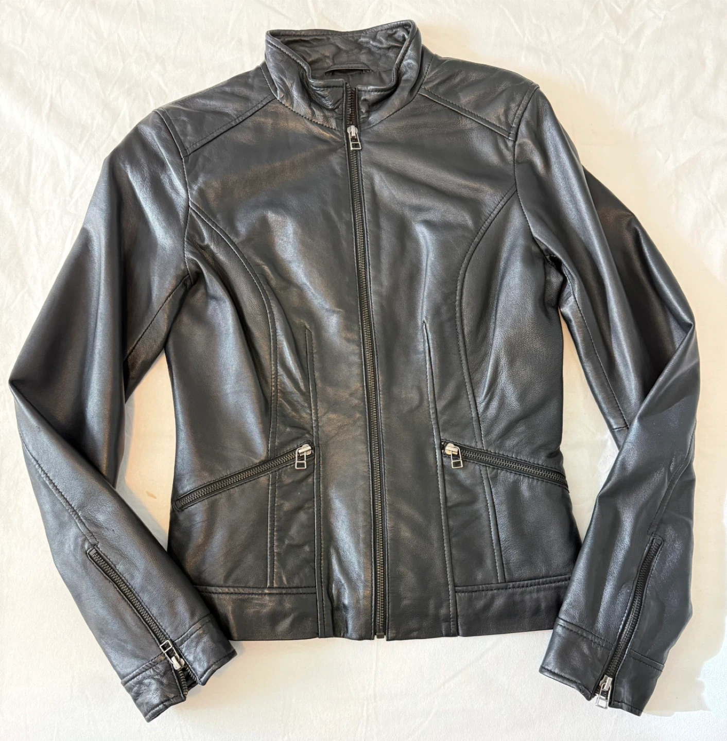 Danier stylish black leather jacket. Front zipper and zippered pockets and sleeves. Size is 2xs but runs a little big in my opinion, more like a small.